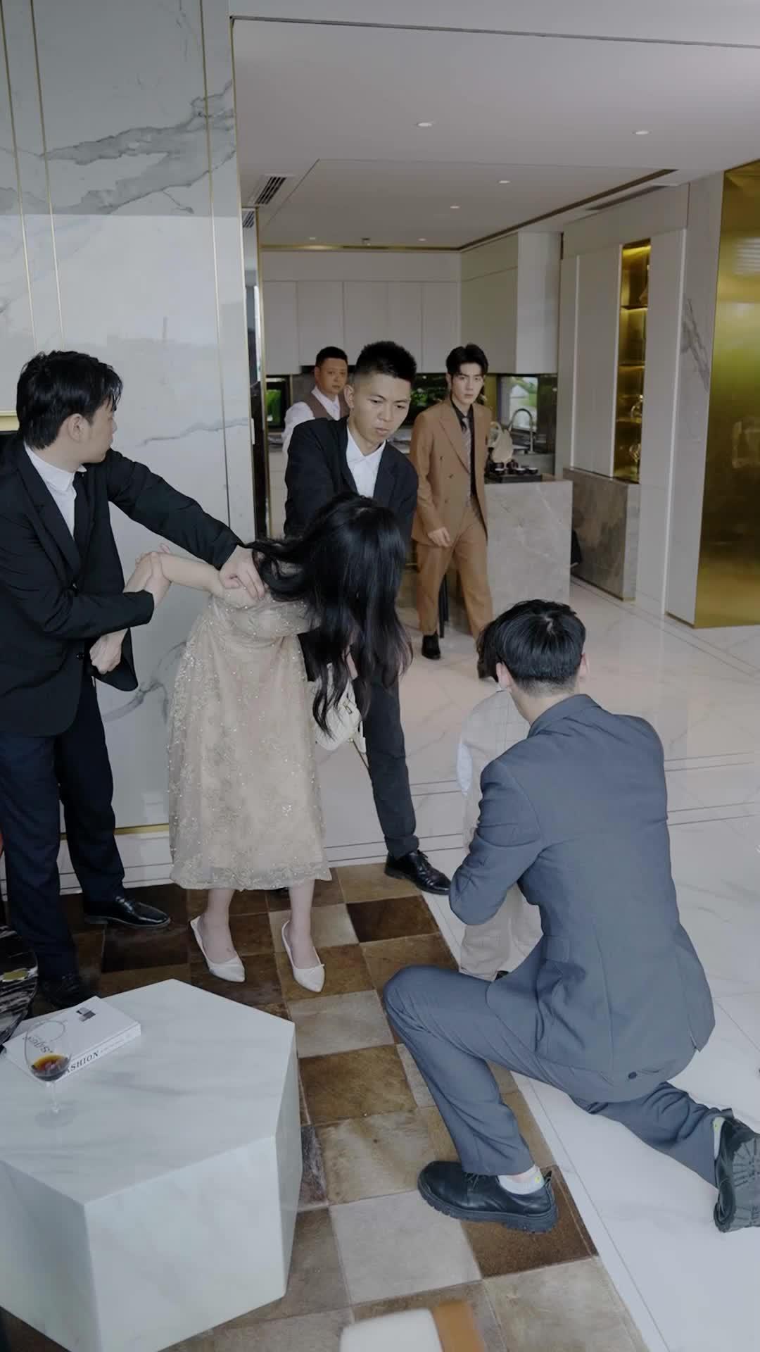 Let’s talk about the quiet detonation that happens in the first ten seconds of *A Beautiful Mistake*—when a woman in a cream lace dress is held by two men, her head bowed, while a third man kneels before her like a supplicant, and behind them, Lin Zeyu stands with a child in his arms, eyes unreadable. It’s not a wedding. It’s not a kidnapping. It’s something far more insidious: a performance of control disguised as ceremony. The marble floors gleam under soft LED lighting, the gold-trimmed cabinets whisper luxury, but the tension is thick enough to choke on. She doesn’t scream. She doesn’t struggle. She just looks sideways—once, twice—with that slow, deliberate tilt of her chin, as if calculating how many seconds until the script breaks. And break it does.