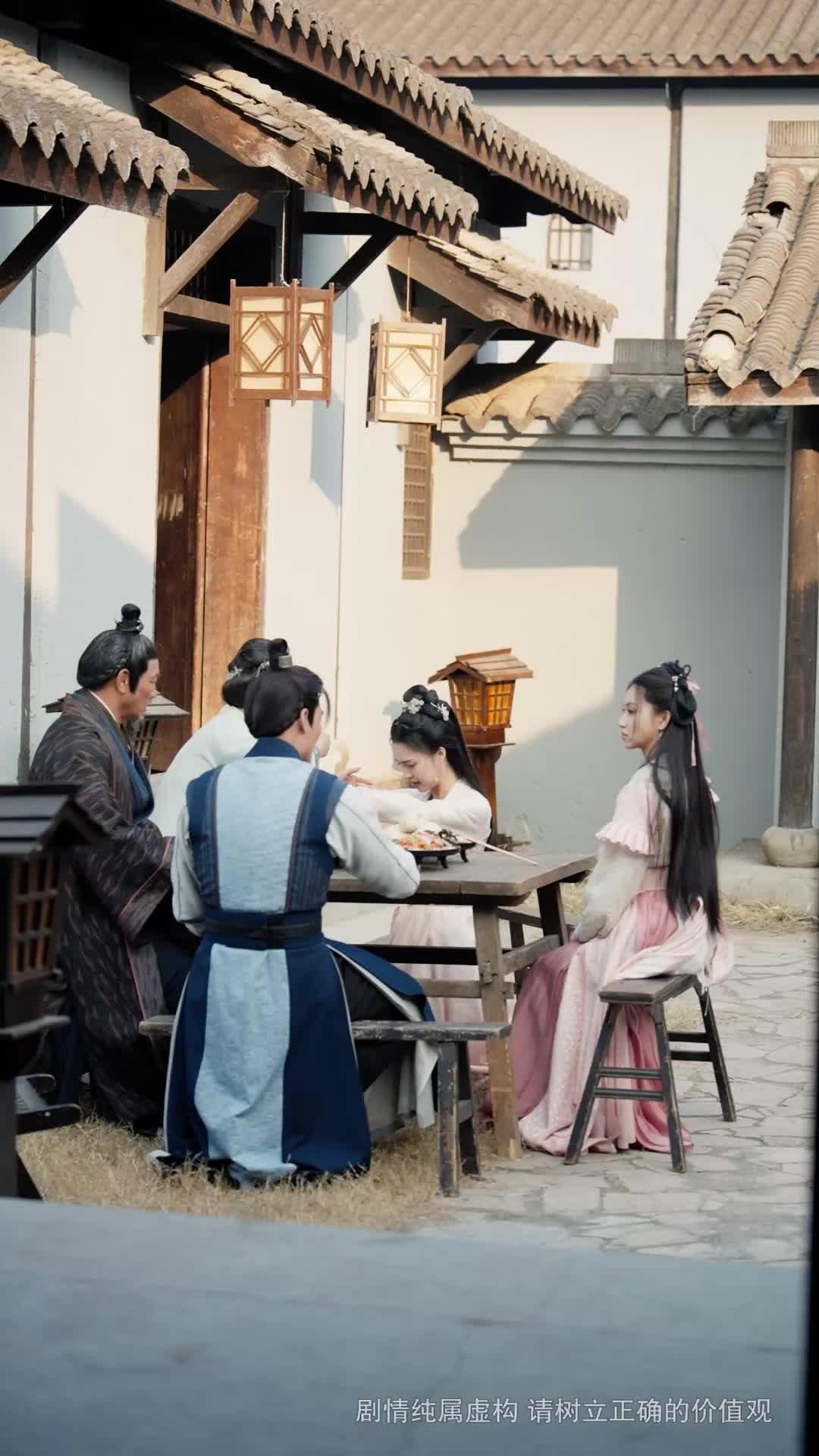 There’s something deeply unsettling about a meal that never gets eaten. In this quiet courtyard scene from *A Duet of Storm and Cloud*, the wooden table is laden with steaming buns, vibrant vegetable medleys, and delicate dumplings—yet no one takes a bite. Not even a chopstick moves toward the plates. Instead, the air thickens with unspoken tension, like smoke curling from a dying fire. The setting—a traditional Chinese courtyard with tiled eaves, hanging lanterns casting soft amber light, and straw-strewn ground—should evoke warmth, nostalgia, even festivity. But here, it feels like a stage set for an emotional reckoning.