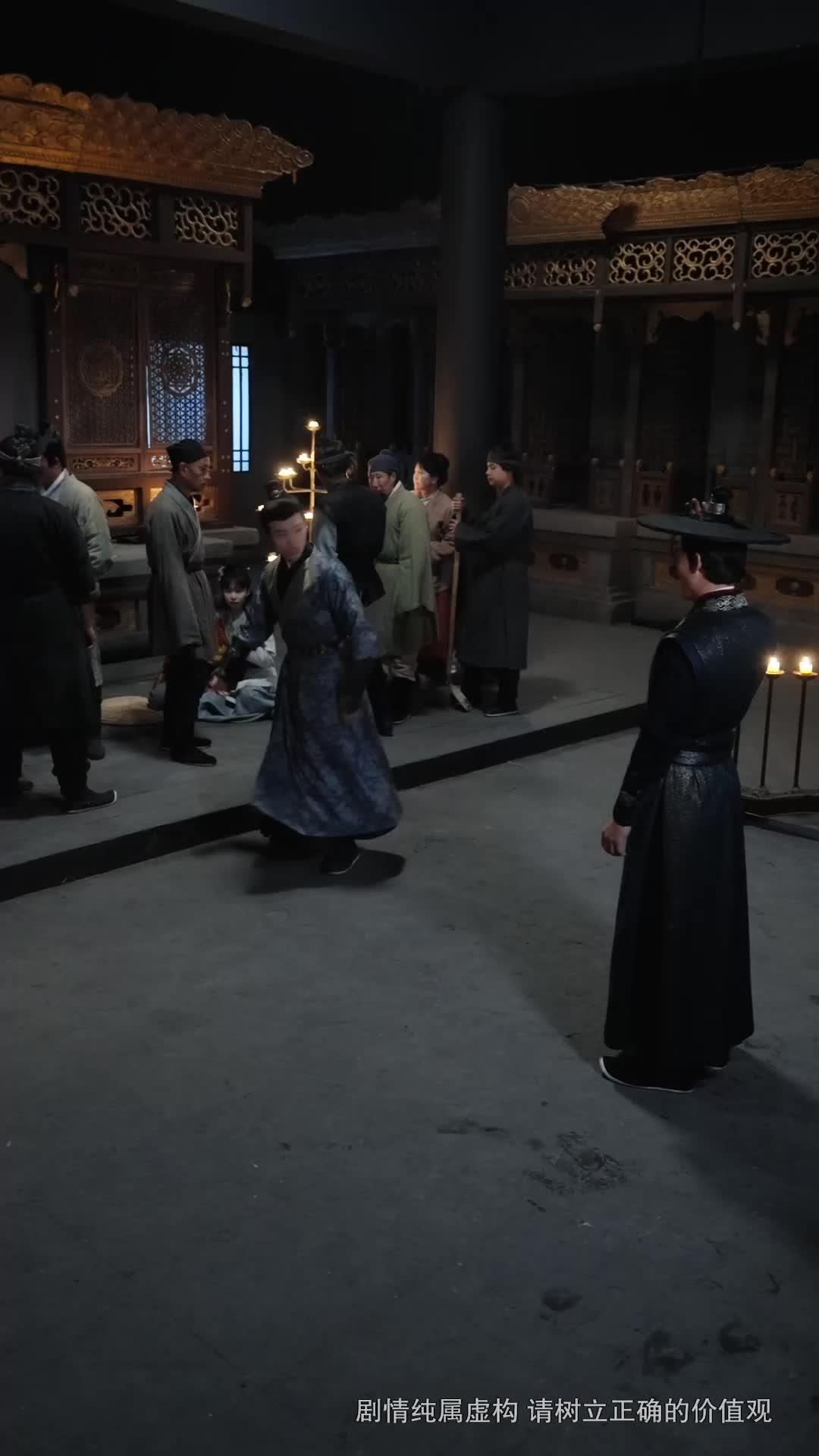 In the dim, candlelit courtyard of what appears to be a provincial magistrate’s hall—or perhaps a clandestine sect’s inner sanctum—the air hums with tension thicker than the incense smoke curling from brass censers. A Duet of Storm and Cloud opens not with thunder, but with silence: the kind that precedes betrayal. At the center stands Li Zhen, his black embroidered robe shimmering like oil on water under the flickering light, his hair coiled high with a silver filigree hairpin—a symbol of rank, yes, but also restraint. Beside him, Jiang Yueru holds her sword not in aggression, but in poised resignation, its pale blue hilt wrapped in silk that matches the softness of her gown, yet belies the steel beneath. Her eyes—wide, unblinking—track every shift in posture, every twitch of the lips of the man now stumbling forward in a patterned indigo robe: Chen Xiao, whose grin once charmed village elders but now twists into something desperate, almost feral.