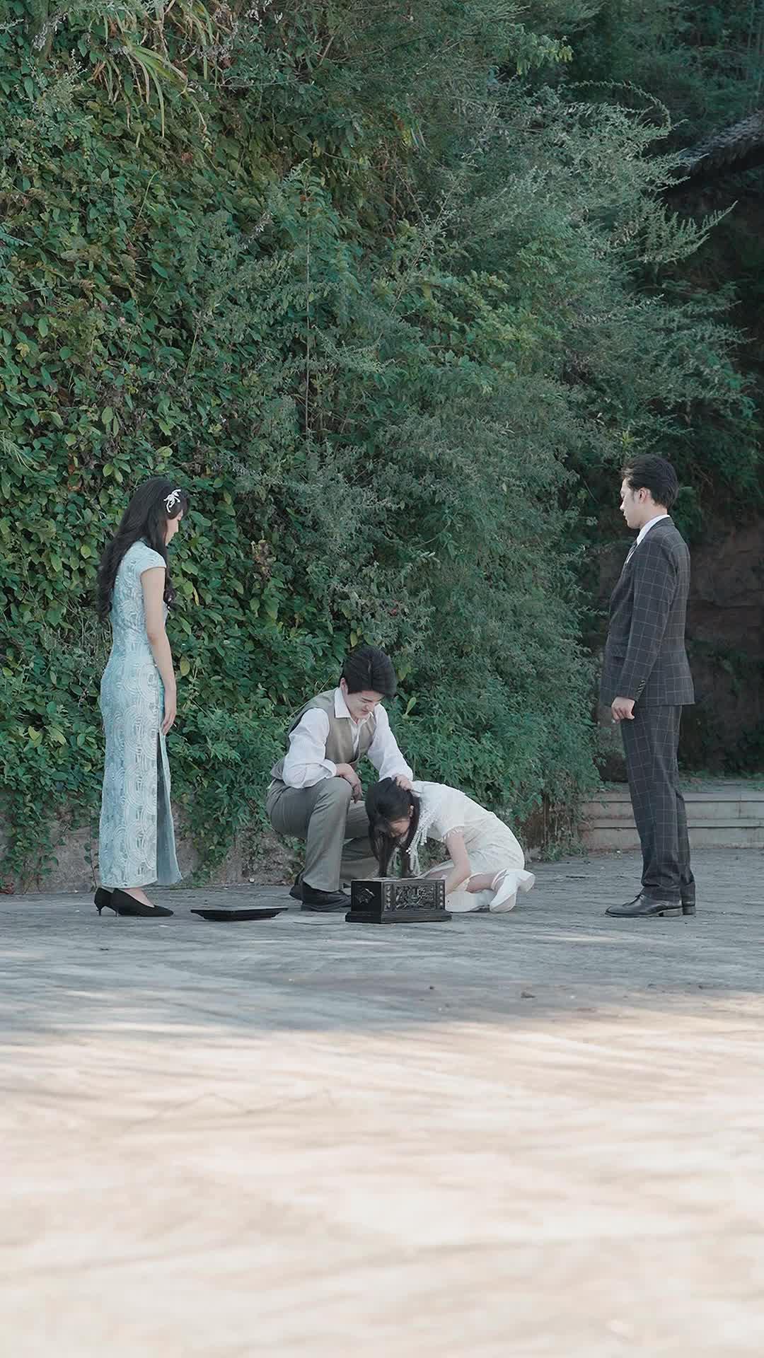 There’s a particular kind of tension that only period dramas can deliver—the kind where every gesture is weighted with history, every glance loaded with unspoken vows, and every piece of clothing tells a story older than the characters themselves. In this pivotal segment of *A Love Gone Wrong*, we’re dropped into a courtyard where time seems to slow, not because of grand declarations, but because of a woman’s hands scraping against stone. Lin Xiao, dressed in a white lace qipao adorned with delicate pearl tassels, is on her knees—not in prayer, but in desperation. Her hair, once neatly pinned, now hangs in damp strands across her face, framing eyes that flicker between terror, grief, and something sharper: resolve. Around her stand three figures, each radiating a different kind of power. Chen Wei, in his tailored grey vest and striped shirt, embodies restrained emotion—his posture upright, his movements precise, yet his eyes betray a storm he’s trying to contain. Su Yan, in her jade-green embroidered qipao, wears her composure like armor, but the slight tremor in her hand as she grips Lin Xiao’s throat reveals the fault lines beneath. And Jiang Tao, in his dark plaid suit, stands apart—not out of indifference, but out of calculation. He watches, arms at his sides, as if waiting for the right moment to speak, or to strike. What elevates this scene beyond mere melodrama is its refusal to simplify motive. When Su Yan chokes Lin Xiao, it’s not rage—it’s fear. Fear that Lin Xiao knows too much. Fear that the past she’s tried to bury is resurfacing. The camera doesn’t cut away. It holds tight on Lin Xiao’s face as her breath shortens, her lips parting in silent protest, her fingers twitching at her sides. And then—Chen Wei intervenes. But not how you’d expect. He doesn’t shove Su Yan aside. He places a hand on Lin Xiao’s shoulder, gentle but firm, and whispers something we can’t hear. His voice is low, urgent, and for the first time, his mask slips: his jaw tightens, his eyes glisten, and he looks not at Su Yan, but at the black box between them—the same box Lin Xiao had been reaching for earlier. That box, carved with a fan motif and lined with frayed gold thread, is the silent protagonist of this scene. It sits there like a confession waiting to be opened. When Lin Xiao finally crawls toward it, her bare hands dragging through dust and debris, you realize this isn’t about retrieving an object—it’s about reclaiming agency. Her fingers, now smudged with grime, trace the edges of the box as if relearning its shape. She doesn’t flinch when Chen Wei steps closer. She doesn’t look up when Su Yan exhales sharply behind her. She’s focused. Obsessed. Because in that box lies the truth—and truth, in *A Love Gone Wrong*, is never kind. The editing here is surgical: rapid intercuts between Lin Xiao’s trembling hands, Chen Wei’s conflicted expression, Su Yan’s tightening grip on her own wrist, and Jiang Tao’s subtle shift in stance—his foot pivoting inward, a telltale sign he’s preparing to act. There’s no background score, only the rustle of fabric, the crunch of gravel underfoot, and the ragged sound of Lin Xiao’s breathing. That auditory minimalism forces you to lean in, to read the subtext in every blink, every swallow, every hesitation. And then—the turning point. Chen Wei reaches out, not to stop her, but to place his hand over hers on the box. A gesture of solidarity? Or control? It’s ambiguous, and that ambiguity is the heart of *A Love Gone Wrong*. Their fingers overlap, both covered in dust, both trembling—not from cold, but from the weight of what’s about to be revealed. Lin Xiao glances up at him, and for a split second, the hostility melts. She sees not the man who doubted her, but the one who’s still willing to stand beside her—even now. Su Yan notices. Her expression hardens. She takes a step back, as if distancing herself from the inevitable. Jiang Tao finally moves—not toward the box, but toward the edge of the frame, where the ivy-covered wall meets the sky. He’s leaving. Or perhaps he’s already gone. The scene culminates not with an explosion, but with a whisper: Lin Xiao lifts the lid. The camera stays on her face. Her breath catches. Her eyes widen—not with shock, but with recognition. She knew what was inside all along. And that’s the true tragedy of *A Love Gone Wrong*: the most devastating truths aren’t the ones we discover, but the ones we’ve been carrying silently, waiting for the right moment to break us. When she closes the box, her hands linger on the lid, pressing down as if sealing a grave. Chen Wei doesn’t ask what she saw. He doesn’t need to. He simply nods, once, and steps back. The power has shifted. Lin Xiao rises—not gracefully, but with effort, her legs shaking, her dress wrinkled, her dignity battered but intact. She doesn’t look at Su Yan. She doesn’t thank Chen Wei. She walks past them both, toward the gate, her heels clicking softly against the stone. The final shot is of the box, now abandoned in the center of the courtyard, sunlight glinting off its worn surface. A single strand of Lin Xiao’s hair drifts down and lands on top of it—like a signature. Like a farewell. *A Love Gone Wrong* doesn’t give you answers. It gives you questions that echo long after the credits roll. Who really betrayed whom? What was in that box? And most importantly—when love goes wrong, who gets to decide what’s forgiven, and what’s buried forever? The brilliance of this sequence lies in its restraint. No shouting matches. No slap scenes. Just four people, one box, and the unbearable weight of what they refuse to say aloud. That’s storytelling at its most potent. That’s why *A Love Gone Wrong* lingers. Because sometimes, the loudest heartbreak is the one that happens in silence.
