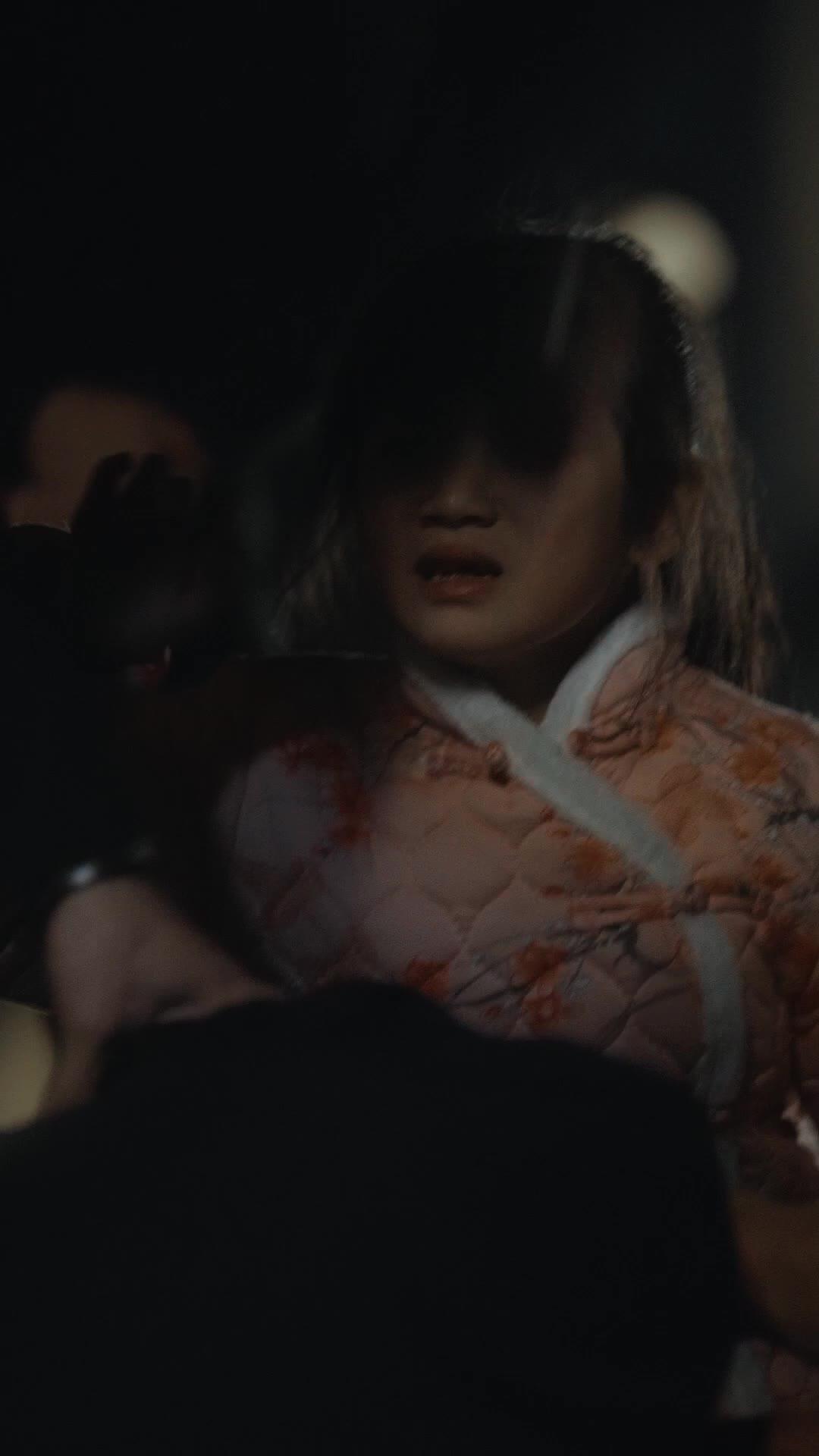 The next scene shifts indoors, to a cramped, dimly lit apartment that smells of old wood, dried herbs, and something faintly medicinal. The walls are peeling at the edges, the shelves hold mismatched ceramics and dog-eared books, and red paper cuttings—traditional symbols of luck and renewal—hang crookedly on the windowpanes. It’s clearly Lunar New Year season, yet the festive decorations feel like relics, not promises. Here, the man who was bleeding on the pavement is now sitting upright on a worn sofa, his suit jacket still on, his shirt slightly rumpled, his nose swollen and purplish. He wipes his face with a white cloth—no, not a cloth. A small bundle of gauze, tightly wrapped, stained faintly pink at the edges. The girl stands beside him, holding another identical bundle in her small hands. Her expression is unreadable—not blank, but layered: concern, curiosity, fear, and something else… recognition.