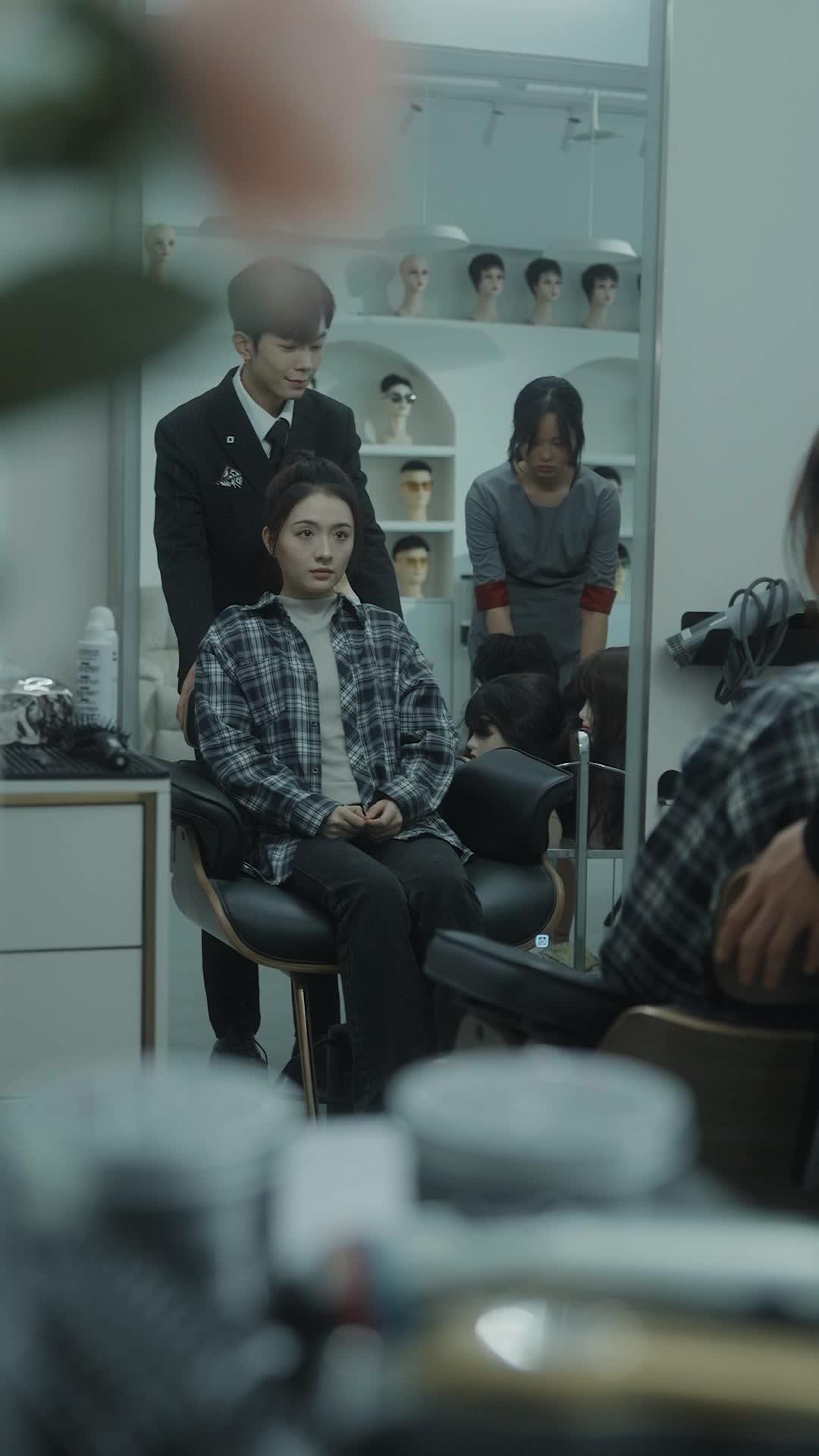 In the quiet, almost clinical ambiance of a modern hair salon—white shelves lined with mannequin heads, soft overhead lighting casting gentle shadows—the tension between expectation and transformation begins to simmer. What appears at first glance as a routine styling session slowly unravels into something far more layered, intimate, and emotionally charged. This is not just about hair; it’s about identity, performance, and the subtle power dynamics that flicker beneath polite smiles and practiced gestures. The central figure, Lin Xiao, sits in the black leather chair like a reluctant protagonist stepping onto a stage she didn’t audition for. Her posture is guarded, her hands clasped tightly in her lap, fingers twisting the hem of her oversized plaid shirt—a visual metaphor for her attempt to shield herself behind familiar textures. She wears a neutral beige turtleneck underneath, a choice that speaks volumes: understated, safe, unassuming. Her hair, pulled back in a high ponytail, is functional, not expressive. It’s the kind of hairstyle you wear when you’re trying not to be seen—not because you’re invisible, but because you’re choosing invisibility as armor.