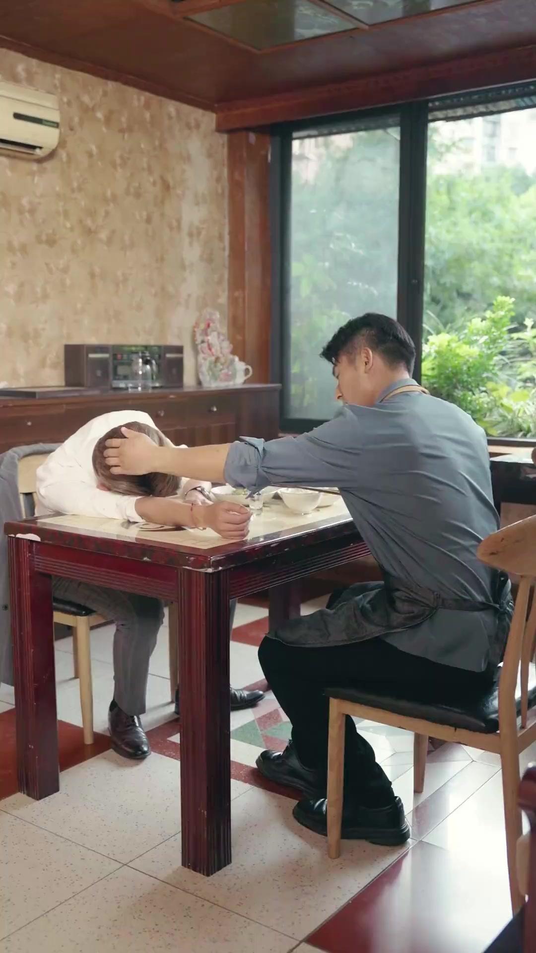 The first act unfolds in near silence. Chen Wei reaches across the table, fingers brushing Li Zeyu’s hair—not to wake him, but to adjust it, as if tending to a sleeping child. Then he pulls out a small object from his apron pocket: a silver ring, simple yet elegant, with a black stone set in its center. He turns it over in his hands, studying its facets like a man reading a confession. The camera lingers on his knuckles, calloused from years of chopping, stirring, serving—hands that have built a life, not just a livelihood. He stands, moves around the table, and gently lifts Li Zeyu’s left hand. The young man’s fingers are relaxed, unresisting. Chen Wei slips the ring onto his ring finger with deliberate care, as though sealing a vow no one else witnessed. It fits perfectly. Not too tight. Not too loose. Just right.