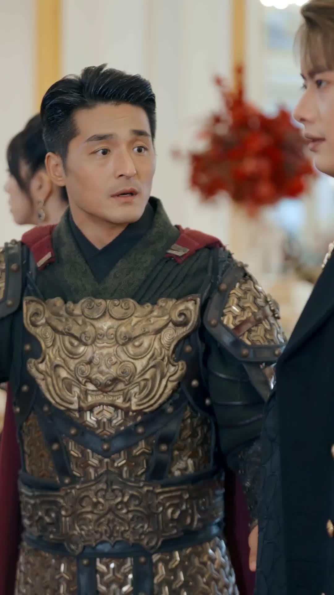Picture this: a grand ballroom, all marble and gilt, where the air smells faintly of beeswax and tension. Red floral installations hang like banners of defiance, and the floor—polished to mirror perfection—reflects not just the chandeliers, but the fractures forming between men who once shared a table, a toast, maybe even a secret. This isn’t a party. It’s a tribunal disguised as diplomacy. And at its heart? Li Wei, standing like a statue carved from legacy, his armor not merely decorative, but *alive*—each plate whispering stories of sieges, oaths, and betrayals buried under layers of lacquer and leather. The lion’s face on his cuirass isn’t ornamental; it’s a warning. Its eyes, cast in aged bronze, seem to follow you even when you look away. Li Wei doesn’t need to raise his voice. His stillness is louder than any shout. Behind him, Lin Xiao watches, her posture rigid, her hands clasped—not in prayer, but in readiness. She’s not just a witness. She’s the archive. Every blink she makes feels like a footnote in a manuscript no one else is allowed to read.
