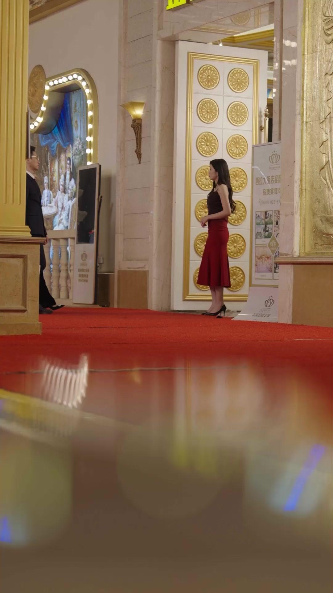 The scene opens like a gilded cage—marble columns, gold-embossed floral reliefs, and a crimson carpet that seems less like a path to glamour and more like a runway toward reckoning. Li Wei, in her strapless black velvet gown with sheer ruffles at the bust and a shimmering teal tulle skirt, stands poised, her hair coiled into an elegant chignon, pearls dangling from her ears, a diamond necklace catching the ambient glow of bokeh lights. She is not just dressed for an event; she is armored for a performance. Her smile is practiced, her posture calibrated—every inch the polished heiress, the woman who knows how to hold space without speaking. But beneath that composure lies a quiet tension, a flicker in her eyes when the camera lingers too long on the woman approaching: Chen Xiao, in a gradient dress that bleeds from deep burgundy at the bodice to fiery scarlet at the hem, her hair loose, her expression shifting like smoke—curious, then wary, then something sharper. This is not a casual encounter. It’s a collision of histories.