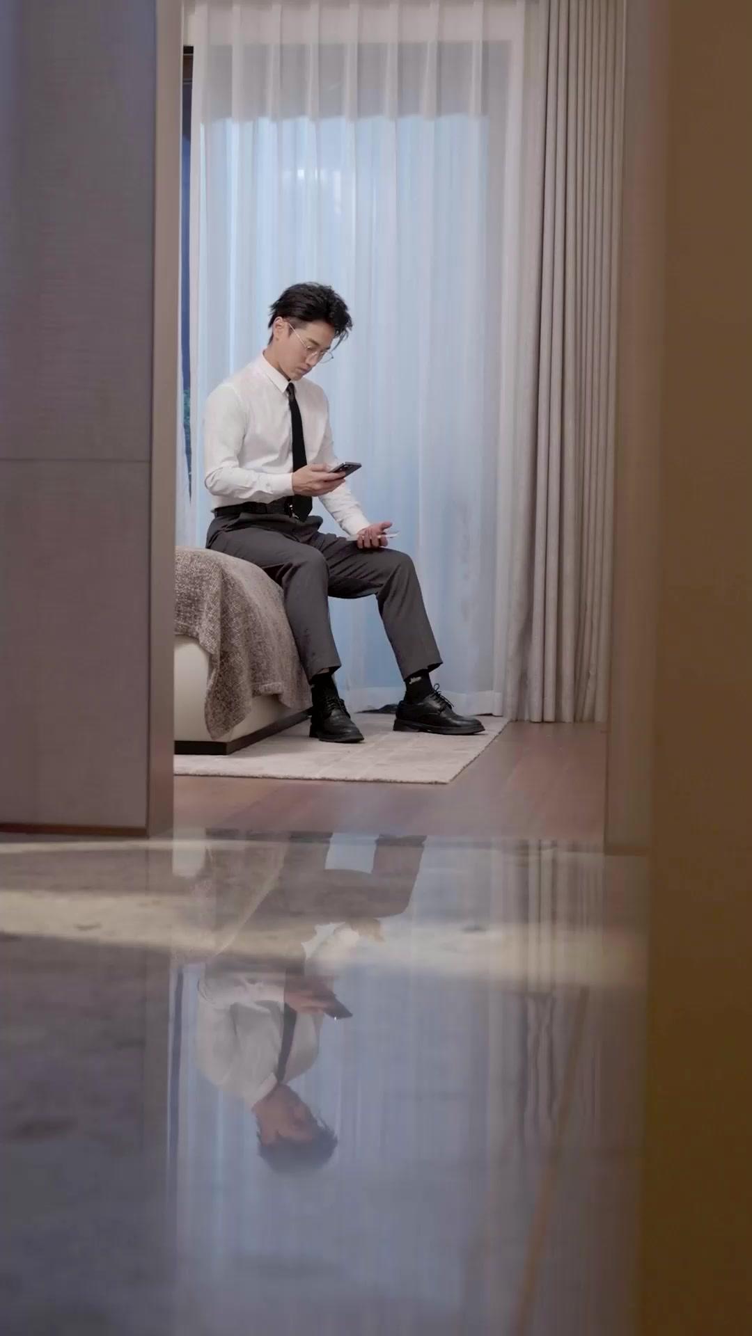 Let’s talk about the blue towel. Not as a prop. Not as a piece of laundry. As a character. In the opening seconds of this sequence from *Beloved, Betrayed, Beguiled*, the towel is carried by Xiao Ran like a relic—something sacred, something recently used, something that smells of steam and vulnerability. It’s draped over her arm, half-hidden, half-displayed, a visual echo of the emotional state she’s entering the room with: partially concealed, partially ready to reveal. The man—Li Wei—sits stiffly on the bed, phone in hand, tie perfectly knotted, shoes polished, hair artfully disheveled. He looks like he’s preparing for a board meeting, not a reckoning. But the reflection on the glossy floor tells another story: his image is distorted, fragmented, inverted. A man who believes he’s in control, yet already reflected as unstable. When Xiao Ran steps into frame, the camera doesn’t cut to her face immediately. It lingers on her feet—white slippers, soft soles, no sound. She moves like someone who knows the architecture of the room, who has walked this path before, but never quite like this. Her entrance isn’t dramatic; it’s inevitable. Like gravity pulling two bodies toward collision.