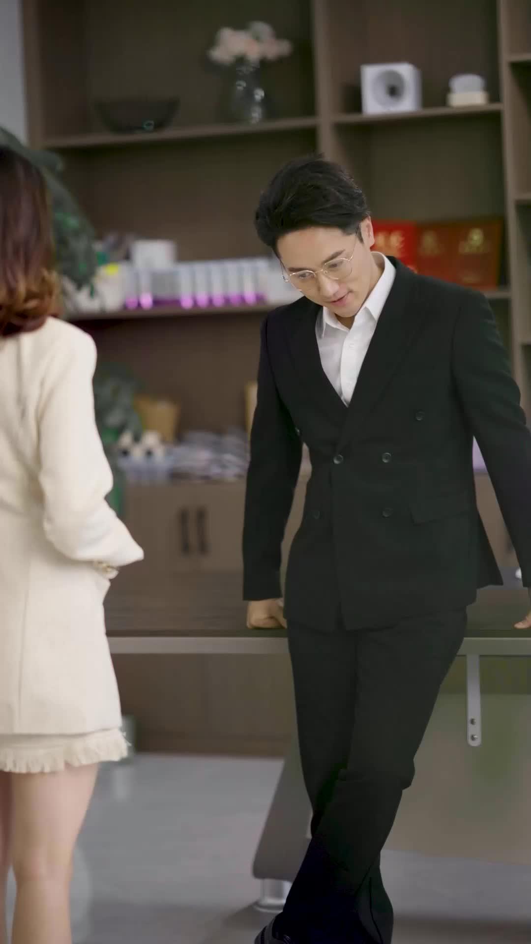 Li Wei’s entrance is textbook corporate seduction: he leans on the desk, spine straight, shoulders relaxed—confidence masquerading as ease. His glasses catch the light like surveillance lenses. When he touches Chen Xiao’s arm, it’s not affection; it’s anchoring. He’s grounding her in *his* reality, ensuring she doesn’t drift into one where she holds agency. Notice how his hand slides from her shoulder to her waist—not possessive, he’d argue, but *supportive*. Yet her posture stiffens. Her breath catches. She doesn’t flinch, but her fingers curl inward, knuckles whitening against the fabric of her coat. That’s the first fracture: the body betraying the face. She smiles politely. Her eyes say, *I see you trying.*
