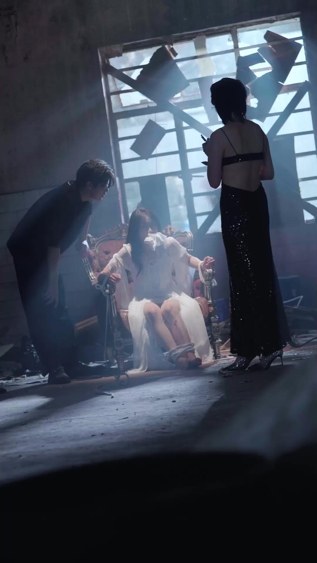 Let’s unpack the staging. The setting is deliberately theatrical: a derelict warehouse, yes, but with that single ornate chair—a relic of Victorian excess—placed center stage like a prop in a gothic opera. Sunlight slices through broken windows, casting long, dramatic shadows that move like accusing fingers. The captive, dressed in translucent white, looks less like a victim and more like a sacrificial priestess—her wounds visible, her posture resigned, her eyes holding a quiet, unnerving intelligence. She’s not pleading. She’s *waiting*. And Lina? She’s the director, the antagonist, the audience, and the executioner—all rolled into one glittering silhouette. Her dress isn’t just glamorous; it’s armor. Sequins catch the light like scattered shards of glass, reflecting the chaos around her while keeping her own core impenetrable. Even her earrings—emerald-cut stones set in gold—glint with cold precision. She’s not here to dominate. She’s here to *prove* something. To herself. To Chester. To the universe.