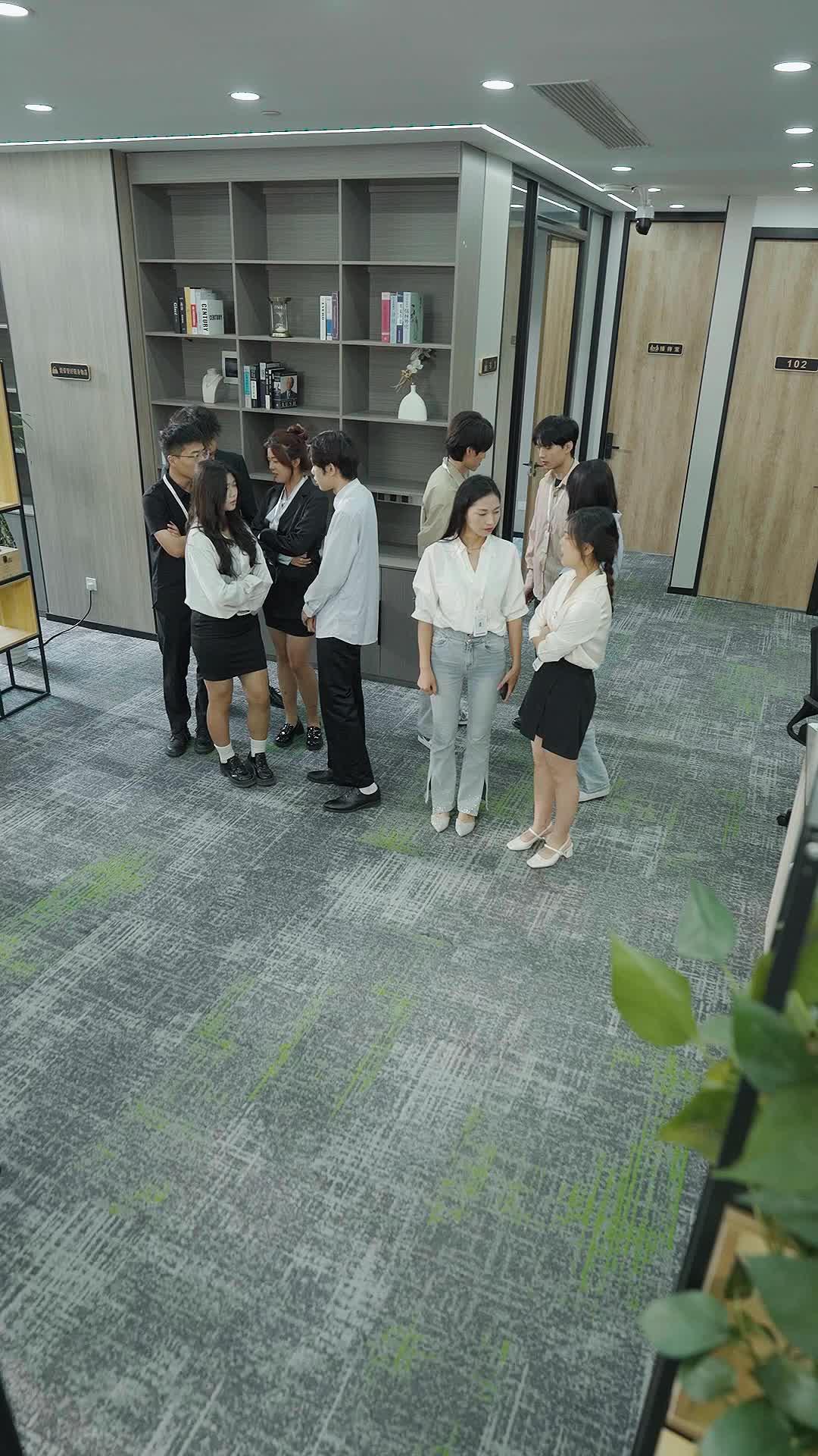 In the opening frames of this tightly wound sequence from *Bound by Love*, we’re dropped into a modern office hallway—not the kind with glass walls and motivational posters, but one that feels lived-in, slightly tense, like the air before a storm. Ten young professionals stand in a loose semicircle, their postures betraying more than their words ever could. The carpet beneath them is gray with streaks of green—subtle, almost accidental, like the emotional undercurrents simmering just below the surface. A bookshelf looms behind them, filled with titles that hint at ambition: business strategy, psychology, even a lone copy of *The Art of War*—a quiet foreshadowing of what’s to come.