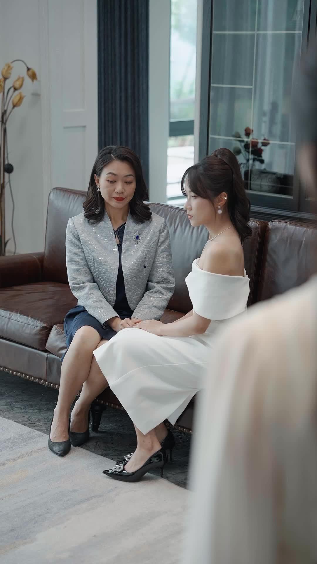 Mr. Wei, meanwhile, is the fulcrum of the entire scene. His entrance—flanked by two silent attendants in black-and-white uniforms—is cinematic in its gravity. He walks not as a man entering a living room, but as a judge stepping into a courtroom. Yet once seated, he becomes malleable: Madame Chen’s hand on his shoulder, his daughter’s hand on his knee—both women anchoring him, pulling him in different directions. His facial expressions shift from stern authority to mild confusion, then to something softer, almost paternal—but only when he looks at his daughter in the off-shoulder white gown. That daughter, let’s call her Jingyi, wears her privilege like armor: diamond necklace, designer heels, a smile that never quite reaches her eyes. She watches Lin Xiao with detached curiosity, occasionally glancing at her father as if checking whether the script is still on track. Jingyi isn’t hostile; she’s indifferent—and that indifference cuts deeper than any insult. In *Bound by Love*, love isn’t declared; it’s allocated, rationed, and weaponized. Jingyi receives hers freely. Lin Xiao must earn hers, and even then, it comes with conditions.