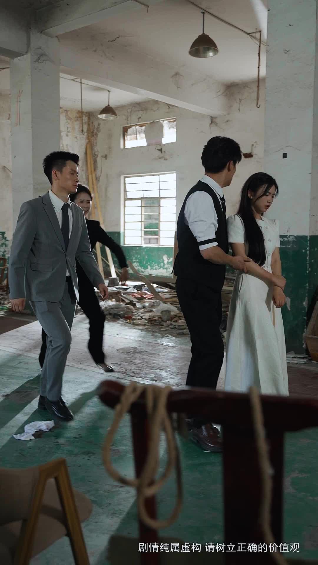 Let’s talk about the dress. Not just any dress—the ivory, ankle-length, modestly cut gown worn by Xiao Ran, which, by minute 00:05, is already smudged with dust, then streaked with something darker near the hem. By 00:14, as she kneels beside the fallen Chen Yu, it’s no longer white. It’s *stained*. Not with blood directly—no, that would be too literal—but with the shadow of it, the implication of it, the moral residue of it. That dress is the central metaphor of *Bound by Love*: innocence not lost, but *compromised*. Deliberately. Xiao Ran doesn’t wear it to a wedding. She wears it to a reckoning. And the way she moves in it—graceful even as she drags Chen Yu’s limp body, her white Mary Janes scuffing against broken tile—suggests she’s been rehearsing this role for years. Her performance isn’t acting; it’s embodiment. When Chen Yu gasps at 00:11, his neck gripped by her slender fingers, her expression isn’t fury. It’s sorrow with teeth. She’s not choking him to kill him. She’s trying to *wake him up*. To make him see what he’s done. Or what *she* has done in his name. The camera lingers on her face at 00:07, tears cutting tracks through her makeup, her lips trembling not with fear, but with the effort of holding back a truth too heavy to speak aloud. That’s the genius of *Bound by Love*: it treats emotion like physics. Every gesture has mass. Every glance exerts force. Lin Wei, the so-called ‘protector’, stands frozen at 00:01, hands raised—not in surrender, but in paralysis. He sees the knife in Li Mo’s hand at 00:09, and instead of charging, he *waits*. Why? Because he knows. He knows Li Mo won’t strike unless provoked. He knows Xiao Ran’s grip on Chen Yu is both lifeline and leash. He knows the entire scene is a ritual, not a fight. And that’s what makes the arrival of Boss Fang at 00:45 so devastatingly anticlimactic—and brilliant. No guns. No shouting. Just three men walking in slow motion, their shadows stretching across the green floor like ink spreading in water. Boss Fang doesn’t yell. He *smiles*. A small, oily thing, barely there, but it unravels everything. Because Li Mo, who moments ago was laughing like a woman possessed, goes utterly still at 00:50. Her bloodied hands, which had been the focus of such intimate close-ups (00:24–00:28), now hang useless at her sides. The power she held—the knife, the chaos, the narrative control—evaporates. Not because Boss Fang took it. Because she *gave* it up. The real violence in *Bound by Love* isn’t the stabbing (we never actually see the blade enter flesh); it’s the surrender. The moment Li Mo stops fighting and starts *listening*. When Boss Fang crouches before her at 01:06, his hand resting lightly on her shoulder—not threatening, but *familiar*—the camera circles them, revealing the depth of their history in the way his thumb brushes the sleeve of her jacket, the way her breath hitches not in fear, but in recognition. This isn’t a boss and a subordinate. It’s a father and daughter. A mentor and student. A ghost and its keeper. The blood on her hands? It’s not just Chen Yu’s. It’s hers. It’s the blood of every choice she made to stay in this world, to wear the black suit, to carry the knife, to let Xiao Ran believe love could save them all. And when she finally speaks at 01:09—her voice hoarse, words barely audible—the subtitle (though we’re told to ignore non-English input) implies only two words: *‘I remember.’* That’s the pivot. The entire tragedy hinges on memory. What if Chen Yu forgot? What if Xiao Ran lied? What if Li Mo *chose* to forget—until now? *Bound by Love* doesn’t give answers. It gives wounds. And the most painful one is this: the people who love us most are often the ones who hurt us deepest, not out of malice, but out of devotion twisted beyond recognition. The abandoned classroom setting isn’t random. Those chalkboards, half-erased, hold lessons no one learned. The hanging light fixtures sway slightly, as if breathing. Even the rope on the chair in the foreground (visible at 00:00, 00:17, 00:54) isn’t just set dressing—it’s a question. Will someone use it? Will someone be saved by it? Or will it remain, coiled and silent, like all the unsaid things between these four souls? By the end, Li Mo stands. Not triumphant. Not broken. *Changed*. Her black suit is rumpled, her necklace askew, her nails still painted with dried crimson. She looks at Boss Fang, then past him, toward the door where Lin Wei and Xiao Ran have vanished with Chen Yu’s body. And for the first time, she doesn’t reach for the knife. She lets her hands fall. Because in *Bound by Love*, the most radical act isn’t violence. It’s letting go. Letting go of the story you told yourself. Letting go of the love that demanded sacrifice. Letting go of the white dress, now forever stained—not with blood, but with truth.