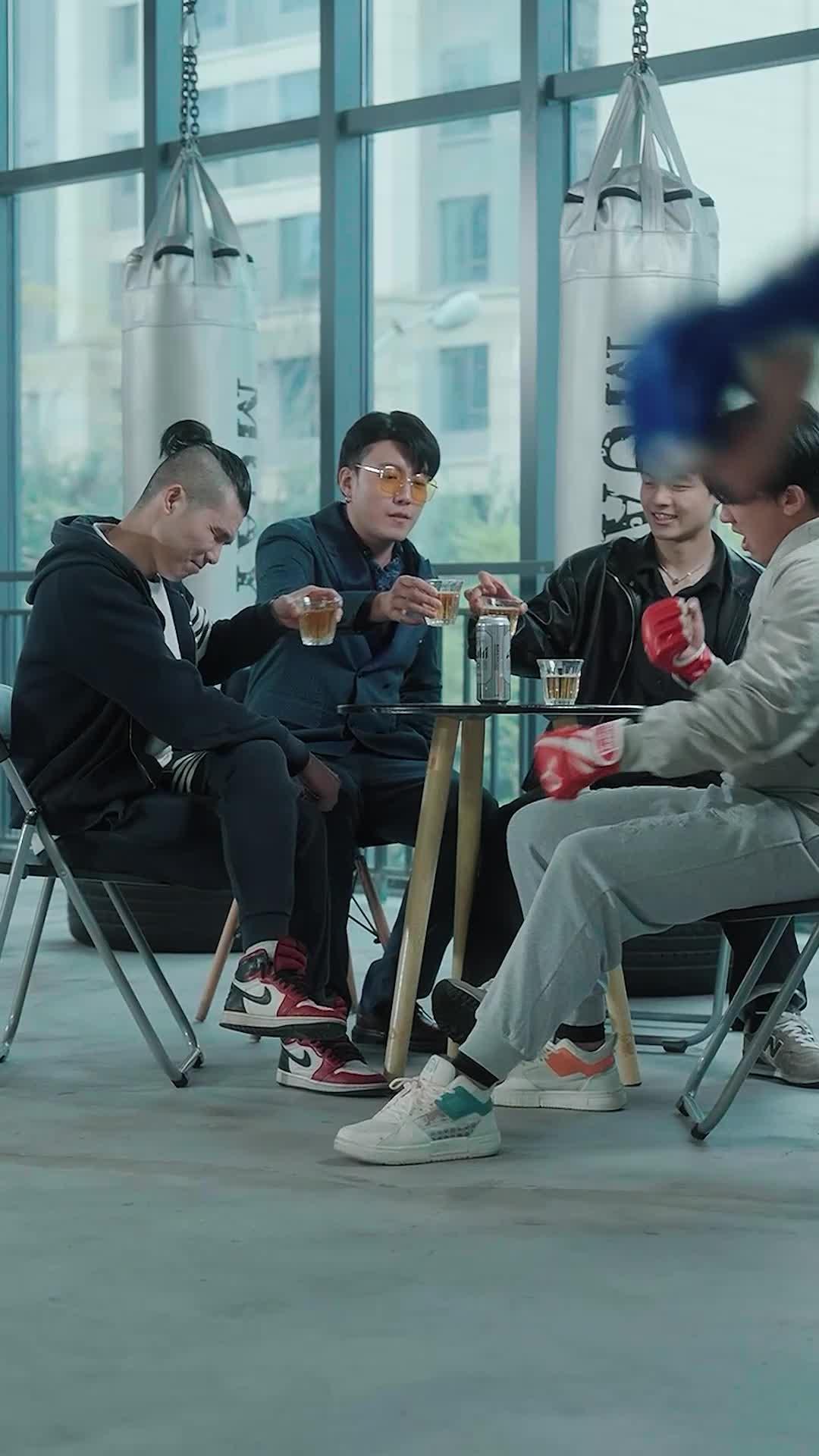 Let’s talk about that moment—when the laughter in the room still echoed off the glass walls, when the Asahi cans sat half-empty on the black table like forgotten relics of a carefree afternoon, and when the four men were deep in their own world of jokes, clinking glasses, leaning back in chairs with the kind of ease only alcohol and camaraderie can buy. That was the scene before *she* arrived. Not with fanfare. Not with shouting. Just footsteps—measured, deliberate, almost silent until they hit the metal stairs. And then, the camera followed her from behind: long black coat, textured shoulders like armor, hair pulled tight into a bun held by a single ornamental pin. No one noticed at first. Not even Li Wei, who was mid-sentence, gesturing wildly with his red boxing gloves still on, as if he’d just finished sparring and hadn’t bothered to change. Not even Zhang Tao, the one in the blue double-breasted suit with yellow-tinted glasses, who had been tilting his head back, eyes closed, savoring the last sip of whiskey like it was poetry. They were all too busy being *themselves*—loud, sloppy, unguarded. But the second she stepped through the doorway beneath the sign reading ‘Jin Qing Boxing Hall’, everything froze. Not metaphorically. Literally. The man in the floral-print jacket—Chen Hao—stopped mid-laugh, mouth open, eyes wide, as if someone had yanked the plug on his nervous system. The guy with the undercut and hoodie—Liu Feng—froze with his glass halfway to his lips, his eyebrows shooting up like startled birds. Even Zhang Tao opened his eyes, slowly, deliberately, and for the first time, his expression wasn’t smug or theatrical—it was wary. Because this wasn’t just any visitor. This was *Brave Fighting Mother*. And she didn’t need to speak to announce herself. Her presence did it for her. She walked in like a storm front rolling over calm waters—no lightning yet, but you could feel the pressure drop. The lighting shifted subtly too: cool daylight from the windows gave way to the dimmer, more industrial glow of the gym interior, where two fighters were still circling each other inside the cage, oblivious. The contrast was jarring. One world—casual, indulgent, almost juvenile—collided with another: disciplined, dangerous, ancient. And she stood right in the middle of it, not moving, not blinking, just *watching*. Her lips were painted dark red, not flashy, but precise—like a signature. Her collar, stiff and lined with snakeskin-patterned trim, caught the light like polished obsidian. You could tell she wasn’t here for drinks. She wasn’t here to join the circle. She was here because something had gone wrong. Or someone had failed. Or a debt had come due. The silence stretched so long that even the clatter of gloves inside the cage sounded louder. Then—finally—Zhang Tao exhaled, a slow, controlled breath, and leaned forward just enough to rest his elbows on the table. His fingers steepled. He didn’t look at her directly. He looked *past* her, toward the entrance, as if calculating angles, exits, consequences. Meanwhile, Chen Hao, ever the peacemaker (or maybe just the most terrified), tried to smile. It was a weak thing, trembling at the edges, like a leaf caught in a sudden gust. He opened his mouth—probably to say something harmless, like ‘Hey, you’re early’ or ‘Did you want a seat?’—but no sound came out. Because Brave Fighting Mother turned her head. Just slightly. Just enough for her eyes to lock onto his. And in that instant, you saw it: not anger. Not disappointment. Something colder. Recognition. Like she’d seen this exact version of him before—same smirk, same nervous energy—and she knew exactly how it ended. Liu Feng, sensing the shift, swallowed hard and set his glass down with a soft click. He didn’t reach for his phone. Didn’t glance at the door. He stayed put, which, in its own way, was the bravest thing he could do. Because in that room, bravery wasn’t about throwing punches. It was about not running. The camera lingered on her face—not in close-up, but in medium shot, letting the background breathe: the hanging disco ball spinning lazily above the cage, the green exit sign glowing like a warning beacon, the faint scuff marks on the concrete floor where fighters had dragged their feet after losing rounds. Everything felt charged. Even the air smelled different now—less beer, more sweat and ozone. And then, just as suddenly as she appeared, she moved again. Not toward them. Not away. She stepped sideways, toward the cage, her coat flaring slightly with the motion. One hand rested lightly on the chain-link fence. Her fingers didn’t grip. They just… rested. As if she were listening. To the fighters. To the silence. To the unspoken history humming between her and the men at the table. That’s when the real tension began—not with a shout, but with a pause. A held breath. A flicker of doubt in Zhang Tao’s eyes, the first crack in his usual performance. Because Brave Fighting Mother didn’t need to raise her voice. She didn’t need to swing a fist. She simply existed in that space, and the room bent around her. That’s the power of presence. That’s what makes *Brave Fighting Mother* more than just a title—it’s a condition. A state of being. When you walk in like she does, people don’t ask who you are. They ask *what you’ve survived*. And judging by the way Liu Feng’s knuckles whitened on the edge of the table, and how Chen Hao’s smile finally collapsed into a grimace, they already knew the answer. The drinking circle was over. The real match was about to begin. And no one at that table—not even Zhang Tao, with all his swagger and silk lapels—was ready for it. What’s fascinating is how the director uses contrast not just visually, but rhythmically. The first ten seconds are loose, handheld, almost documentary-style—glasses clinking, heads bobbing, laughter overlapping. Th