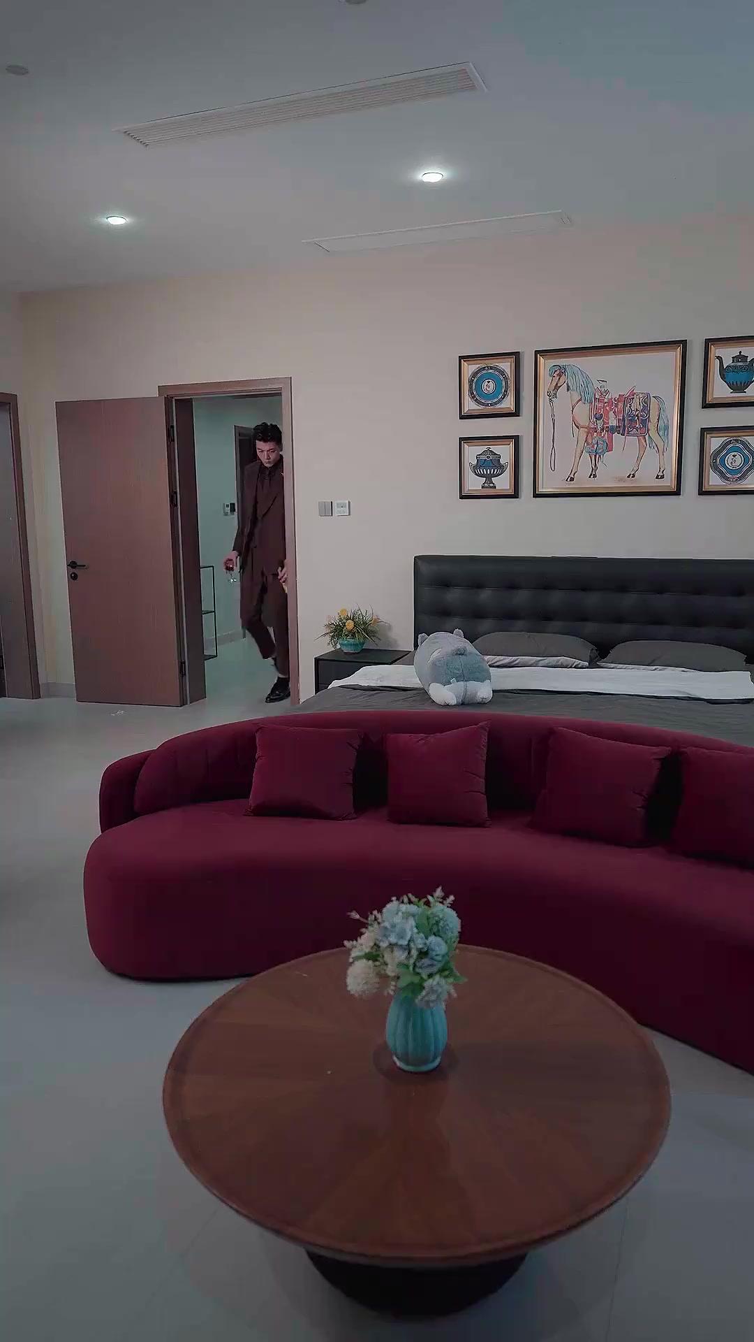 Let’s talk about the quiet devastation of a man in a brown three-piece suit, holding a wine glass like it’s the last relic of a civilization he’s trying to forget. This isn’t just a scene—it’s a psychological autopsy, performed in real time, with plush toys as witnesses. The opening shot of the bedroom is deceptively elegant: deep burgundy sofa, minimalist coffee table with a turquoise vase holding delicate white and blue blooms, framed art of a stylized horse on the wall—everything curated for aesthetic control. But the moment Chen Yifan steps through that doorway, carrying a bottle and a glass, the tension coils tighter than the lapel pin on his jacket. He doesn’t walk—he *enters*, each step measured, deliberate, as if gravity itself has been recalibrated by grief. He places the bottle beside the nightstand, where a gray-and-white hamster plush lies face-down on crisp white sheets, its tiny embroidered heart turned away from the world. That detail alone tells you everything: this isn’t decor. It’s evidence.