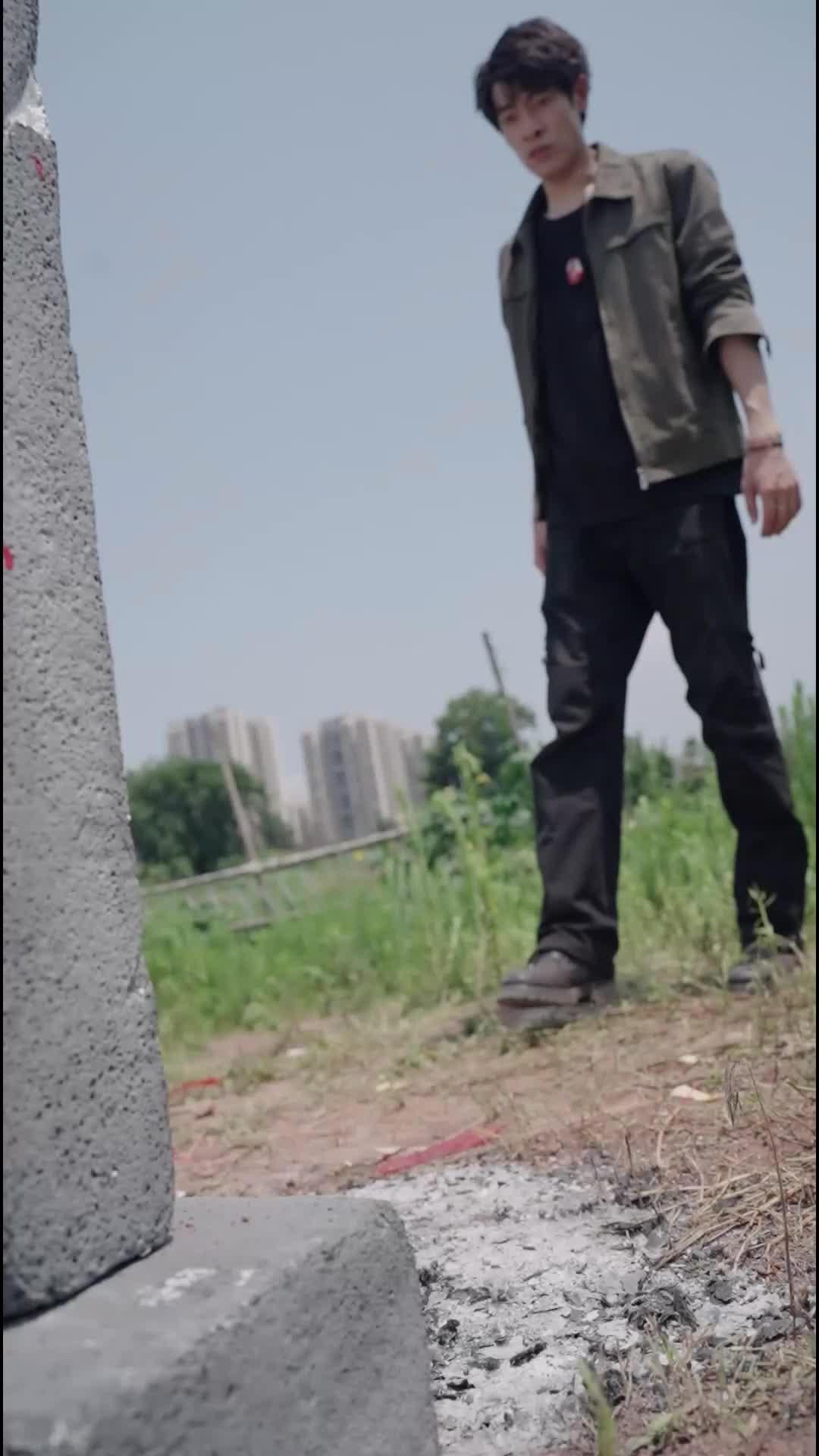 The opening shot—black, silent, heavy—sets a tone not of suspense, but of inevitability. When the screen finally lifts, we see Lin Jian standing beside a weathered stone marker, half-buried in overgrown weeds, his posture rigid, eyes fixed on something unseen beneath the earth. He’s dressed in practical layers: olive jacket, black cargo pants, boots scuffed from walking too far on broken ground. A red-and-white pendant hangs low against his chest, its surface carved with faint, almost ritualistic grooves. It’s not jewelry—it’s a relic. And he knows it. The camera lingers on his hands, trembling slightly as he kneels, then presses his forehead to the dirt. Not prayer. Not grief. Something deeper: surrender. The grave isn’t marked with a name, only three characters in faded crimson ink—‘Xiao Feng Zhi Mu’—a phrase that, if translated loosely, reads ‘Tomb of the Little Phoenix.’ But there’s no phoenix here. Only ash, scattered like cigarette butts near the base of the stone, and a single red thread tied around the man’s wrist, knotted tight enough to leave a pale ridge in his skin.