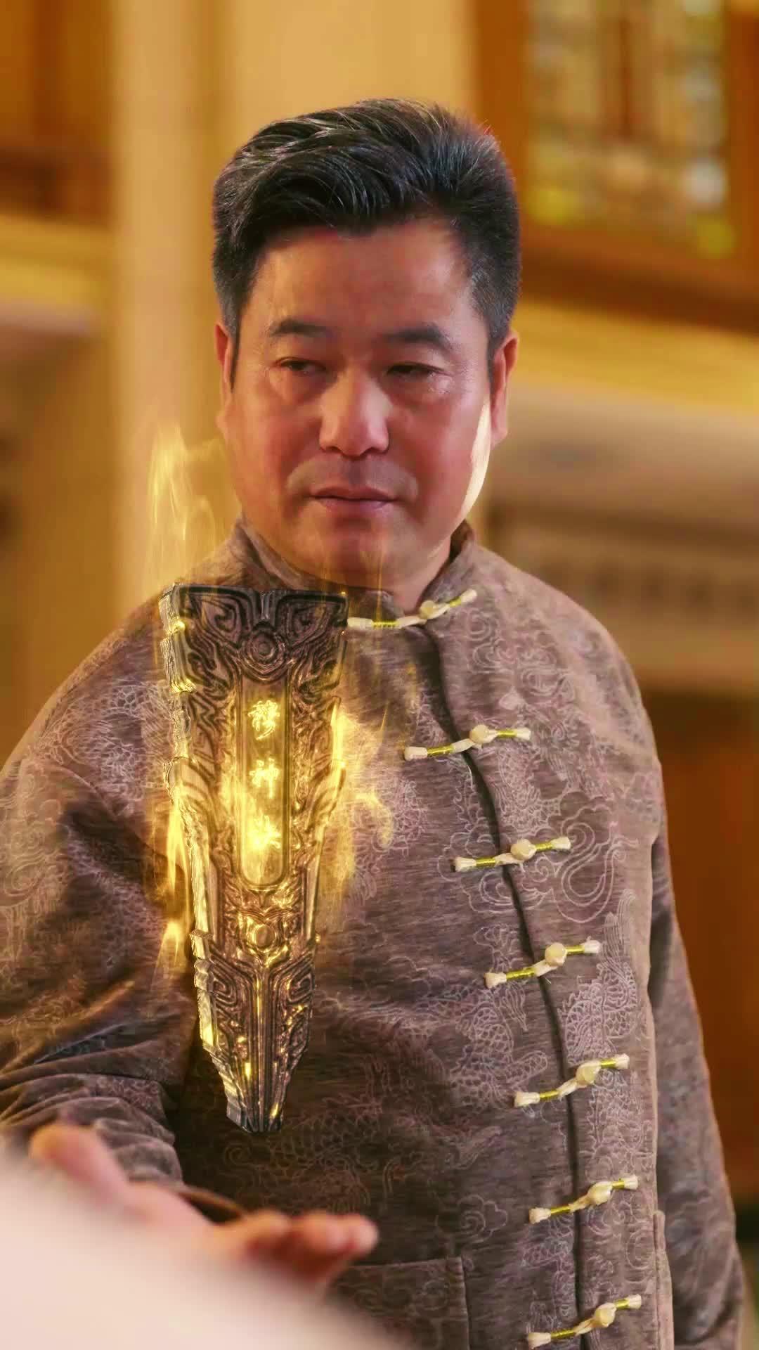 In the opulent banquet hall draped in crimson floral carpets and gilded chandeliers, a quiet storm brews—not with thunder, but with golden light, blood, and silence. Delivery Hero: Rise of the Loong opens not with fanfare, but with a man in a traditional brocade tunic, his expression unreadable as he holds aloft a glowing artifact—a vertically elongated relic carved with arcane glyphs, pulsing like a captured sun. This is not mere decoration; it’s a conduit. The artifact hovers above his palm, suspended by unseen force, its aura casting flickering halos across his face. His eyes—steady, almost weary—suggest he’s done this before. He isn’t performing magic; he’s *enduring* it. Every frame of his presence carries the weight of someone who knows the cost of power. When he speaks (though no audio is provided, his mouth moves with deliberate cadence), one imagines words laced with ancient oaths and unspoken regrets. His posture remains upright, yet his fingers tremble slightly—not from weakness, but from containment. The artifact doesn’t obey; it *negotiates*. And in that tension lies the first clue: this isn’t a hero’s ascension. It’s a reckoning.