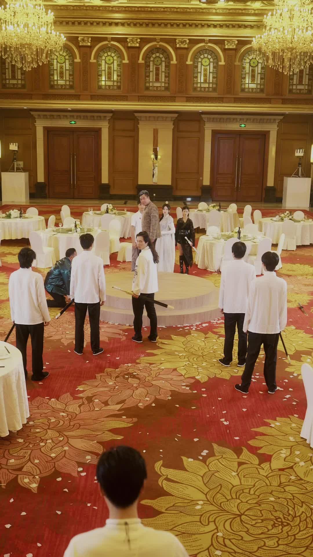 What elevates this sequence beyond mere exposition is how the environment participates in the storytelling. The red carpet, patterned with oversized peonies, feels like a battlefield disguised as a feast. Petals—real or artificial?—litter the floor, as if the room itself is shedding its decorum. The chandeliers cast long shadows that dance across the walls, turning static figures into moving silhouettes of doubt and resolve. Even the background details matter: the framed photographs on the side table (a family? A past alliance?), the untouched wine glasses, the way the enforcers stand with feet shoulder-width apart—not aggressive, but *ready*. This isn’t staging. It’s archaeology. Every object, every posture, every hesitation is a layer of history being excavated in real time. And at the heart of it all is the unspoken question that hangs heavier than the chandeliers: *What happens when the heir refuses the crown?* Delivery Hero: Rise of the Loong doesn’t answer it outright. It lets the silence breathe. It lets Zhou Yun smirk, Yue Qingxue steady her breath, Lin Feng swallow hard, and Master Guan watch—waiting, always waiting—for the moment the dam breaks. And when it does? Well. Let’s just say the fan will open again. And this time, the bamboo won’t be the only thing bending.