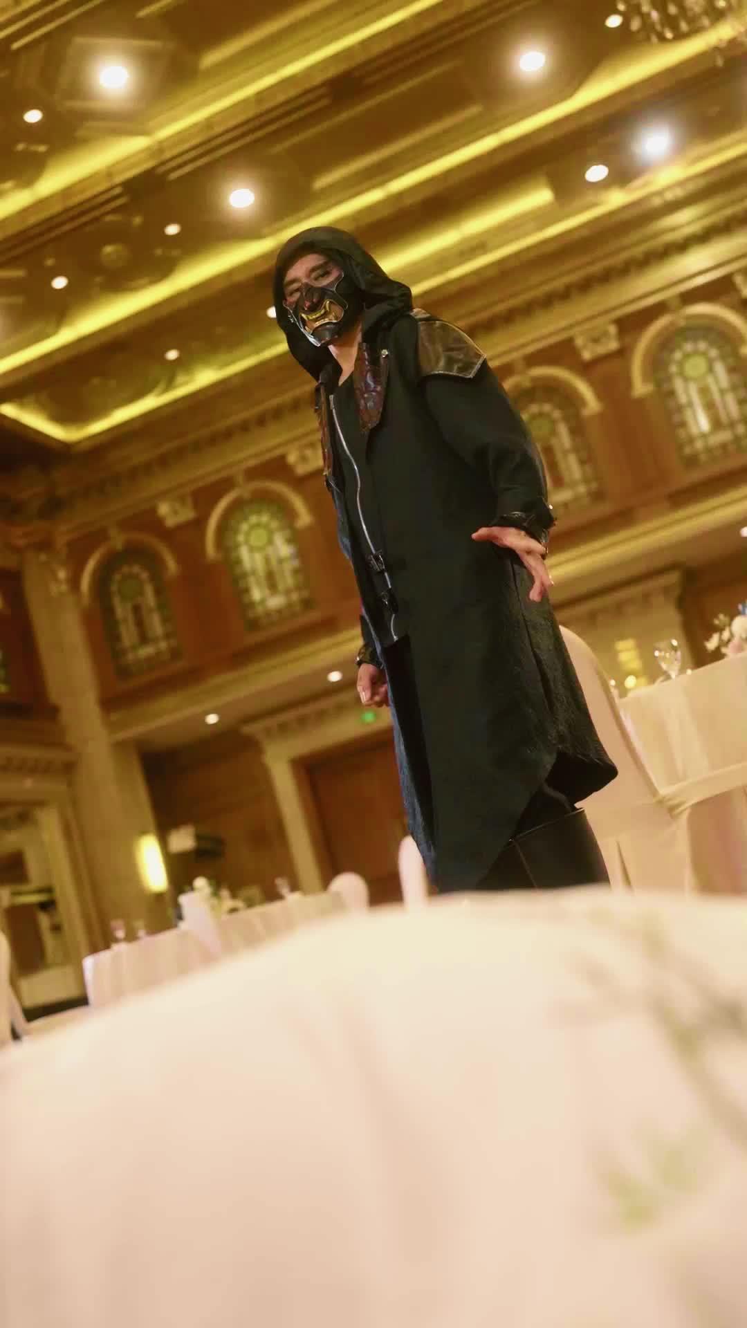 In the opulent, gilded hall of what appears to be a grand banquet venue—its ceiling dripping with crystal chandeliers, its carpet a riot of crimson and gold floral motifs—the tension doesn’t just simmer; it *crackles*, like static before lightning. This isn’t a wedding reception or a gala dinner. It’s a battlefield disguised as elegance, and every character in Delivery Hero: Rise of the Loong is playing their role with terrifying precision. The central figure, clad in a long black coat lined with red-threaded sigils and a hood that swallows his face whole, isn’t merely wearing a mask—he’s *becoming* it. The mask itself is a masterpiece of theatrical menace: black lacquer, gold-trimmed fangs bared in a permanent snarl, eyes hollow yet somehow alive with malice. He doesn’t walk; he *glides*, each step deliberate, each gesture a punctuation mark in a silent monologue only he can hear. His hands move like serpents—open-palmed one moment, clawed the next—as if conjuring shadows from thin air. And indeed, he does. Black smoke, thick and viscous, coils around his limbs like loyal hounds, responding to his will with eerie obedience. This isn’t CGI fluff; it’s choreographed sorcery, a physical manifestation of his dominion over decay and dread.