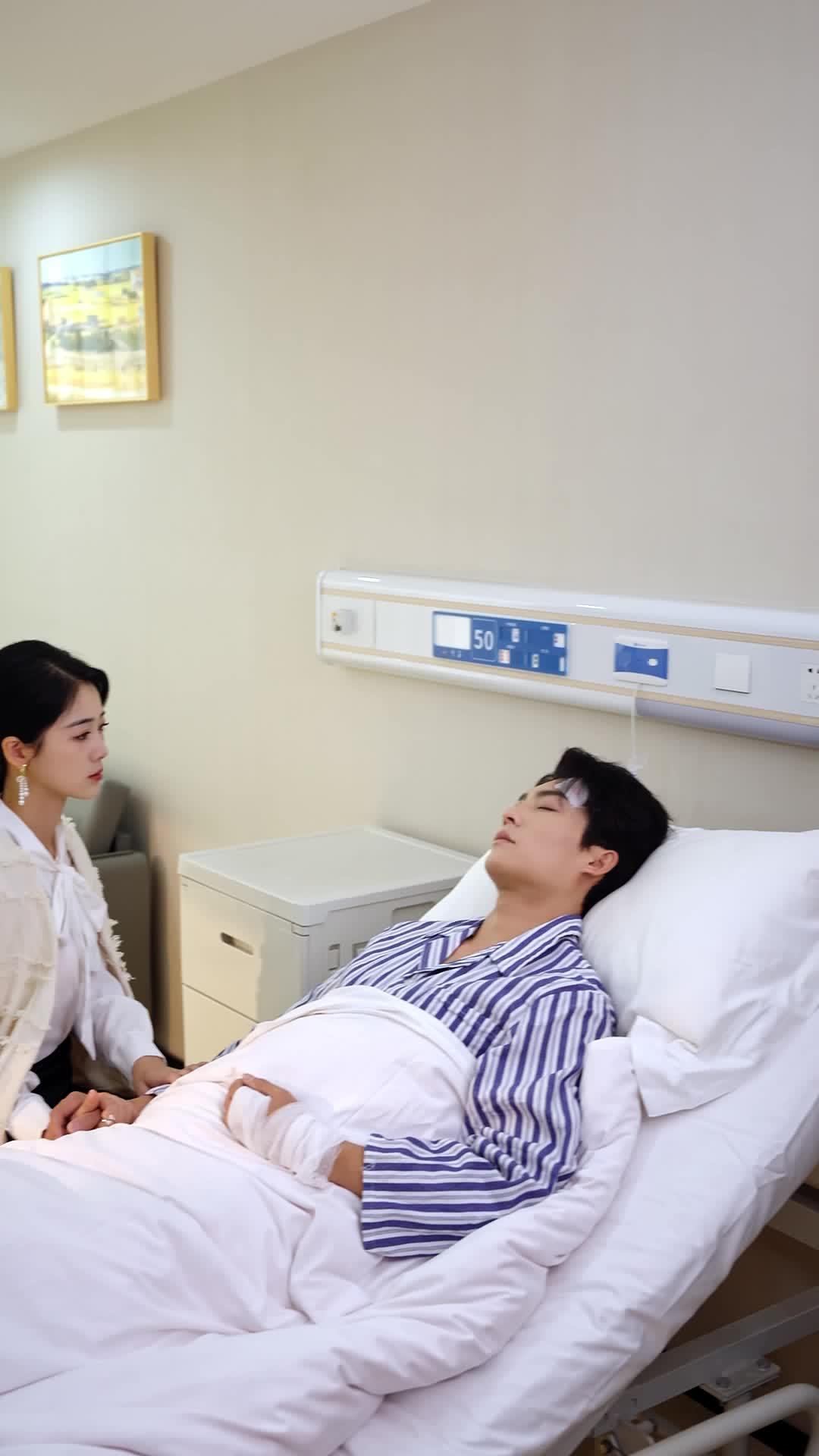 Notice how the camera lingers on their hands—interlocked, then separated, then reconnected. At 00:13, Shen Yiran’s fingers trace the edge of his bandage, her nail polish chipped at the corner, a tiny flaw in an otherwise immaculate facade. That detail matters. It tells us she hasn’t slept. She’s been here for hours, maybe days. Her makeup is flawless, but her exhaustion leaks through in the slight puffiness beneath her eyes. Lin Xiao, meanwhile, shifts his gaze upward—not toward the ceiling, but toward the wall-mounted monitor displaying ‘50,’ the room number that now feels less like a location and more like a verdict. His mouth moves silently. He’s rehearsing words he may never say. Or perhaps he’s already said them, and she’s choosing not to hear.