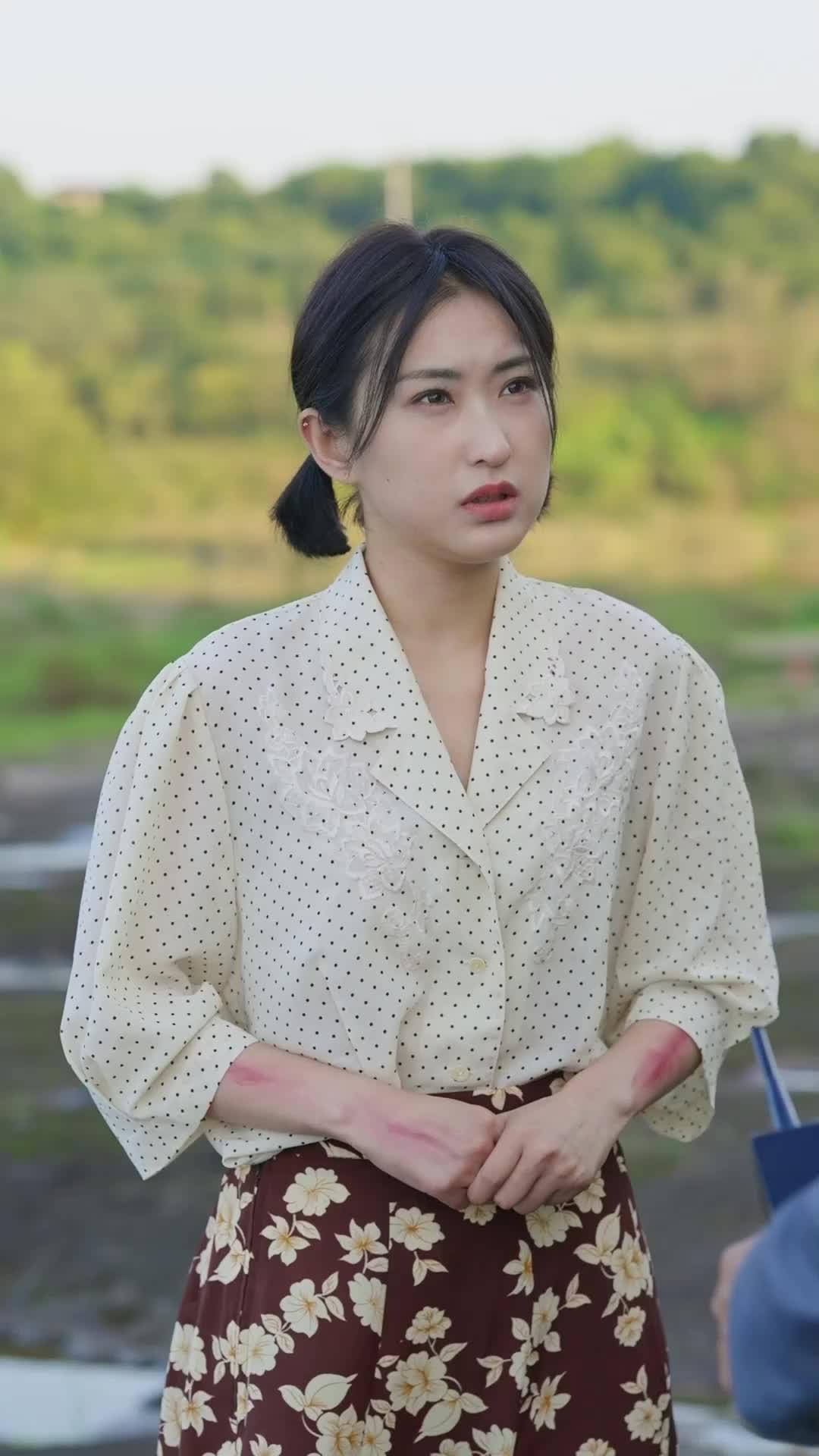 In the opening frames of *Echoes of the Past*, we’re dropped into a quiet rural field—sunlight soft, grass swaying, hills blurred in the distance like a watercolor wash. But the tranquility is deceptive. Standing there, hands clasped tightly before her, is Li Wei: a woman whose posture screams restraint, whose eyes flicker with something unspoken—fear? Resignation? Grief? Her cream polka-dot blouse, delicate lace trim at the collar, contrasts sharply with the raw red abrasions on both forearms. Not accidental scrapes. These are deliberate marks—evidence of struggle, of resistance, of something she’s trying to hide even as she stands exposed. She doesn’t flinch when the camera lingers; instead, she blinks slowly, lips parted just enough to suggest she’s holding back words that could shatter the fragile equilibrium of this scene.