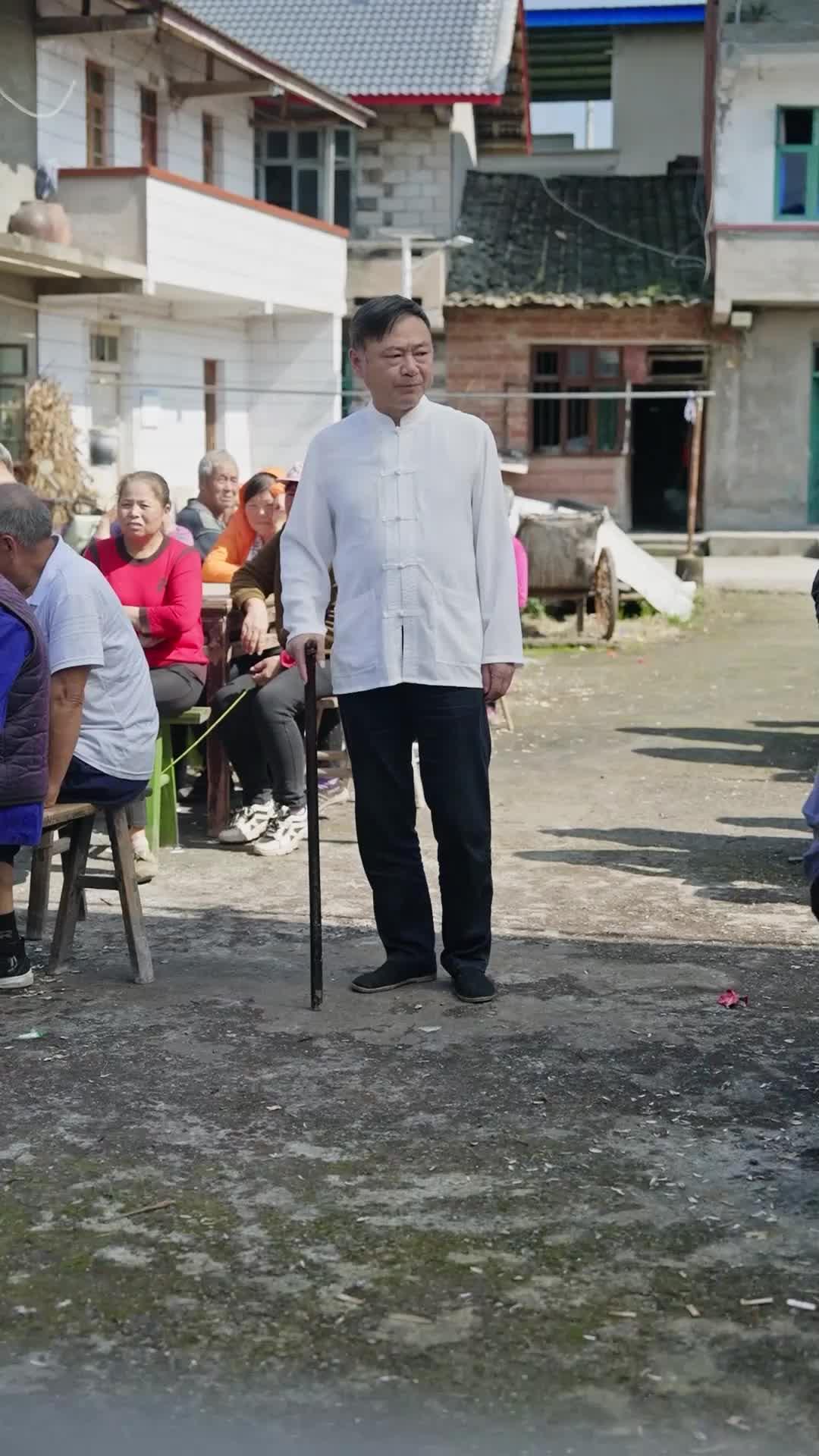 In the sun-dappled courtyard of a rural Chinese village, where weathered brick walls whisper decades of quiet resilience and red lanterns hang like forgotten promises, a single wooden cane becomes the fulcrum upon which an entire community’s emotional equilibrium teeters. This is not merely a wedding scene from *Echoes of the Past*—it is a slow-motion detonation of unspoken histories, where every glance, every shift in posture, and every hesitant word carries the weight of generational silence. At its center stands Uncle Li, a man whose white traditional tunic—clean, crisp, yet subtly wrinkled at the cuffs—contrasts sharply with the deep black trousers and the worn, dark wood of his cane. His hair, streaked with silver like river silt after a flood, frames a face that has long mastered the art of stillness. Yet his eyes betray him: they flicker, narrow, widen—not with anger, but with the profound exhaustion of someone who has spent a lifetime holding back a tide. He does not speak first. He listens. And in that listening, the audience feels the gravity of what has not been said for years.