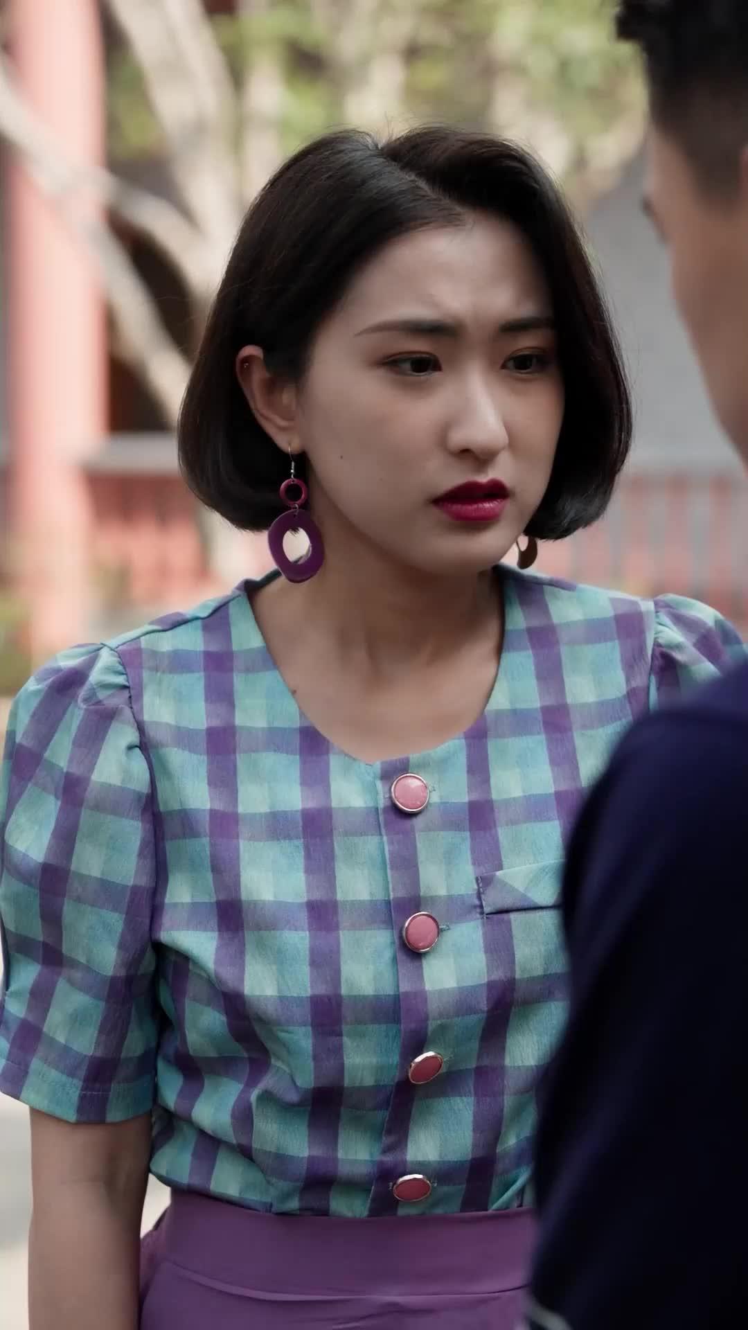In the quiet courtyard of an old-style residential compound—where gray brick walls whisper forgotten histories and potted bonsai trees stand like silent witnesses—the emotional architecture of *Echoes of the Past* begins to reveal itself through micro-expressions, wardrobe choices, and spatial dynamics. What appears at first glance as a casual outdoor confrontation quickly evolves into a layered psychological tableau, where every gesture carries weight, every pause echoes with implication. At the center of this unfolding drama is Chen Xiao, whose short bob haircut, bold purple-and-teal gingham blouse, and oversized geometric earrings signal both confidence and vulnerability—a visual paradox that mirrors her internal conflict. Her posture remains composed, hands clasped low in front of her, yet her eyes betray a flicker of unease whenever Li Wei enters the frame. Li Wei, dressed in a beige suede blazer over a crisp white shirt, moves with theatrical urgency, his facial contortions oscillating between pleading, indignation, and performative sorrow. His gestures are expansive—fingers splayed, palms upturned—as if appealing not just to Chen Xiao, but to some unseen moral tribunal. Yet his performance feels rehearsed, almost desperate, suggesting he’s not merely defending himself but reconstructing a narrative he fears has already collapsed.