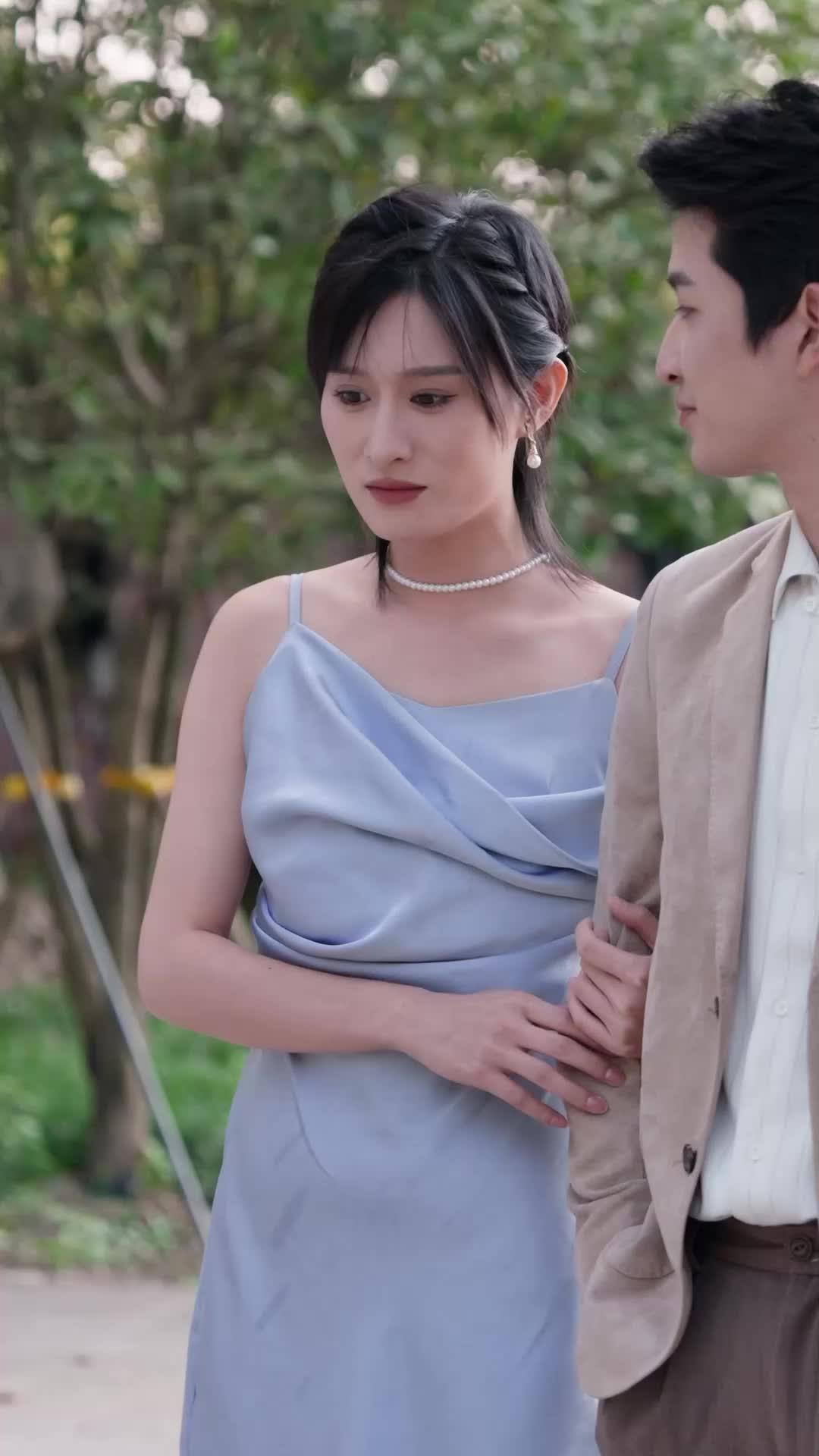 In the quiet courtyard of a traditional Chinese residence—where grey bricks whisper centuries and bonsai trees stand like silent witnesses—the tension between Li Wei and Chen Xiao unfolds not with shouting, but with the subtle tremor of a wineglass. *Echoes of the Past*, a short drama steeped in restrained emotion and layered social codes, delivers a masterclass in visual storytelling through micro-expressions and spatial choreography. What begins as a serene stroll—Li Wei in his beige suede blazer, crisp white shirt, and neatly combed hair; Chen Xiao beside him in a pale blue satin dress, pearl choker glinting under soft daylight—quickly unravels into something far more complex. Her fingers clutch his forearm, not in affection, but in anxious anticipation. Her eyes dart sideways, lips parted mid-sentence, as if rehearsing a confession she’s too afraid to voice. He, meanwhile, gazes ahead with practiced calm, though his jaw tightens ever so slightly when she speaks—his posture rigid, his silence louder than any retort. This is not romance. This is negotiation disguised as companionship.