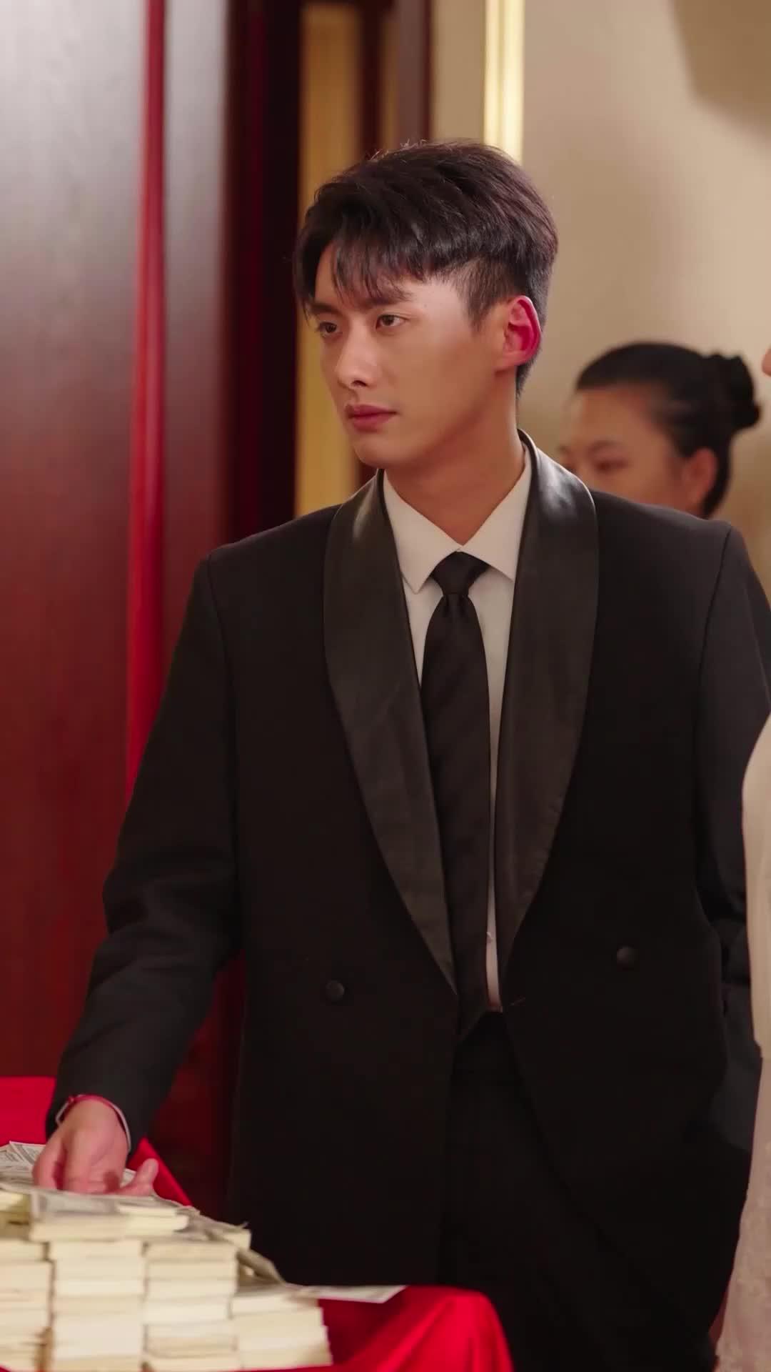 In the opening frames of *Falling for the Boss*, we’re thrust into a world where wealth isn’t just displayed—it’s weaponized. A man in a sleek black tuxedo with satin lapels stands beside a table draped in crimson cloth, his fingers brushing over neat stacks of cash like a pianist testing keys before a performance. His expression is unreadable—calm, almost bored—but his posture betrays tension: shoulders squared, jaw subtly clenched. Behind him, a woman in a green qipao watches with lips parted, eyes wide—not with awe, but suspicion. This isn’t a celebration; it’s a tribunal disguised as a banquet. The red tablecloth isn’t decorative; it’s symbolic—a stage for power plays, where money becomes both currency and accusation. Every bill on that table whispers a story: who paid whom, who owed what, and who’s about to lose everything.
