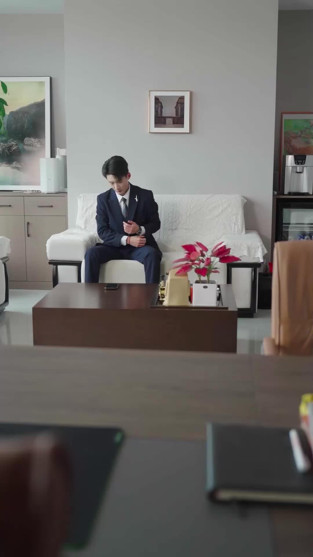 The opening frame of *Falling for the Boss* is deceptively serene: Lin Jian, seated like a statue in a boardroom disguised as a living room, adjusting his cufflinks with the precision of a man preparing for execution. The décor whispers wealth—light wood, abstract art, a water dispenser humming softly in the corner—but the air is thick with unspoken history. Then the door creaks open, and Su Wei enters, all ivory and restraint, her posture radiating quiet competence. But her entrance isn’t the inciting incident. It’s the *second* woman who shatters the equilibrium: Chen Xiao, striding in like she owns the oxygen in the room, her black patent ensemble gleaming under the LED panels, her white bow a stark contrast to the aggression in her stride. She doesn’t greet Lin Jian. She *claims* him—sinking onto the sofa beside him, her hand sliding onto his knee, her laughter bright and brittle, like glass about to shatter. Lin Jian’s reaction is telling: he doesn’t rebuff her, but his eyes dart toward the doorway where Su Wei stands frozen, her expression unreadable, yet her pulse visible at her throat. This isn’t flirtation. It’s territory marking. And Su Wei? She’s the ghost in the machine—present, essential, invisible.