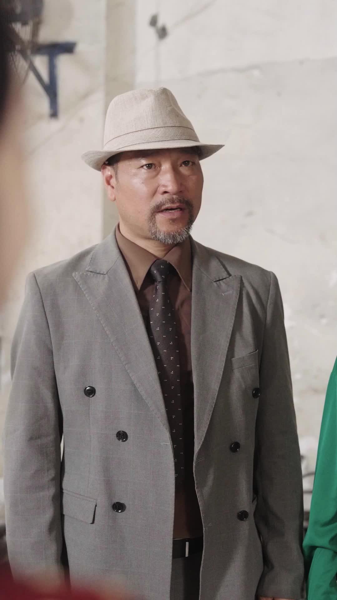 Across from them, the older man—Mr. Lin, distinguished by his grey double-breasted suit, patterned tie, and light fedora—cuts a figure of authority and weary experience. His beard is salt-and-pepper, his gaze sharp but not unkind, and his posture remains upright even as he shifts weight between feet, signaling internal deliberation. Beside him stands Liu Meiling, in a vibrant emerald-green silk blouse and corduroy skirt cinched with a gold-buckled belt. Her earrings dangle delicately, catching the sparse overhead light; her makeup is precise, her lips painted a deep rose—but her expression is one of restrained anguish. She does not speak much, yet her presence dominates the periphery like a silent chorus. When Mr. Lin places a hand on her shoulder—once, twice—it’s not comfort, but confirmation: a gesture that says *I see you, and I’m still choosing this path*. Her eyes well, but no tear falls. That restraint is more devastating than any outburst.