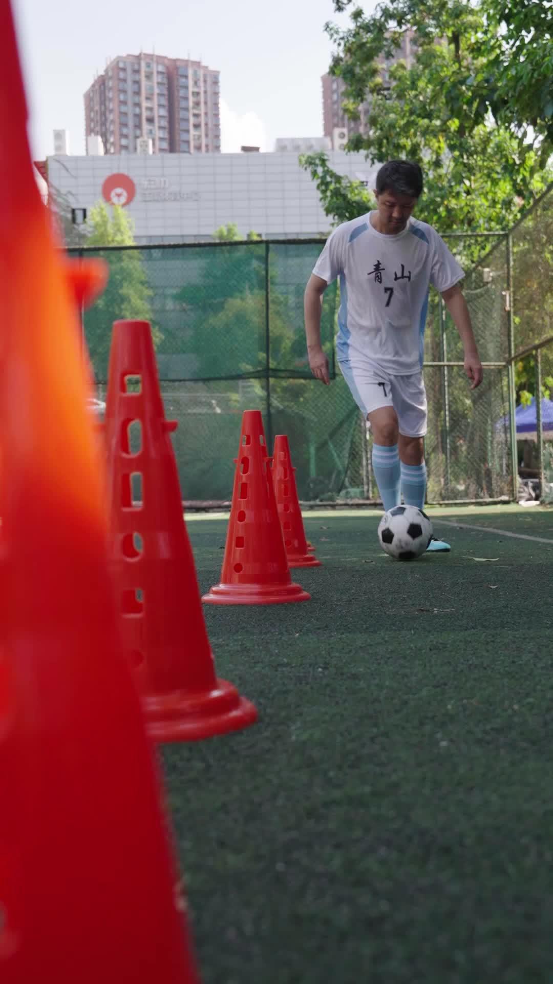 There’s something quietly devastating about a man in a white jersey with the characters ‘Qingshan’ and the number 7, standing still on artificial turf while orange cones line up like silent witnesses to his unraveling. This isn’t just a football drill—it’s a psychological checkpoint. Li Wei, the player, moves with practiced precision at first: low center of gravity, quick footwork, ball hugging his instep like a secret he’s sworn to protect. But then—something shifts. His eyes flicker toward the gate where two figures approach: Zhang Ming, in a crisp white shirt, hands clasped behind his back like a school principal who’s just caught a student cheating on an exam; and Lin Xiao, her blouse immaculate, black ribbon tied neatly at the neck, hair pinned with a silver claw clip that glints under the sun like a tiny weapon. She doesn’t walk—she *advances*. And Li Wei stops. Not because he’s tired. Not because the ball slipped. He stops because the drill has ended—not by design, but by intrusion.