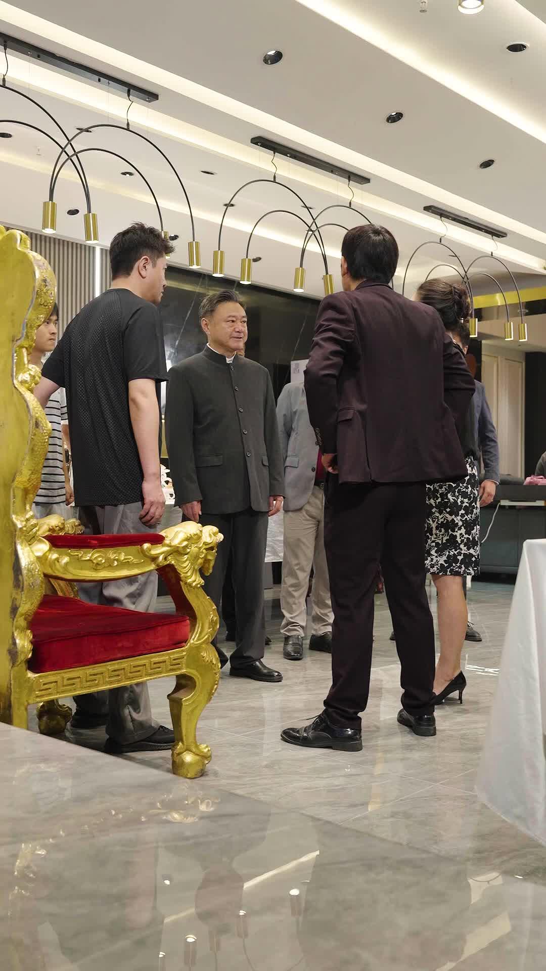 In a sleek, modern banquet hall bathed in golden pendant lights and polished marble floors, a quiet storm gathers around a single ornate chair—gilded, lion-headed, upholstered in crimson velvet. This is no ordinary throne; it’s a symbol, a silent protagonist in a drama where power isn’t seized but *perceived*, and loyalty is measured not in words but in micro-expressions. At its center stands Li Wei, the man in the black athletic tee—his posture rigid, his eyes darting like a cornered animal. He doesn’t speak much, yet every flinch, every tightened jaw, tells a story of someone who walked into this room expecting celebration and found interrogation instead. Behind him looms the imposing figure of Master Chen, dressed in a traditional dark grey Zhongshan suit—its mandarin collar crisp, its buttons aligned like soldiers on parade. His demeanor is calm, almost serene, but his gaze flickers with something colder: disappointment, perhaps, or calculation. He watches Li Wei not as a mentor would watch a protégé, but as a judge watches a defendant whose verdict has already been written.