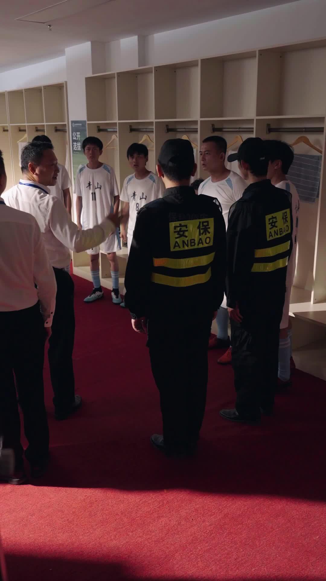 The opening scene of *Football King* drops us straight into a locker room thick with tension—red carpet underfoot, white lockers lining the walls like silent witnesses. A group of players in matching white jerseys emblazoned with ‘Qingshan’ and numbers like 7, 8, 10 stand clustered, their expressions ranging from confusion to defiance. Two security guards in black uniforms with bright yellow reflective stripes—‘ANBAO Security’ stitched boldly on their backs—step forward, not as enforcers but as reluctant mediators. One player, number 10, short-cropped hair, sweat still glistening on his temples, locks eyes with a man in a crisp white shirt and lanyard. There’s no shouting yet—just a charged silence, the kind that precedes an explosion. Then it happens: a sudden shove, a grab, and chaos erupts. Players surge forward, arms flailing, voices rising—not in anger, but in panic, in protest. Number 10 is seized by both arms, his body twisting as he tries to break free, his mouth open mid-scream, eyes wide with disbelief. This isn’t just discipline; it’s betrayal. He’s not resisting arrest—he’s resisting erasure.