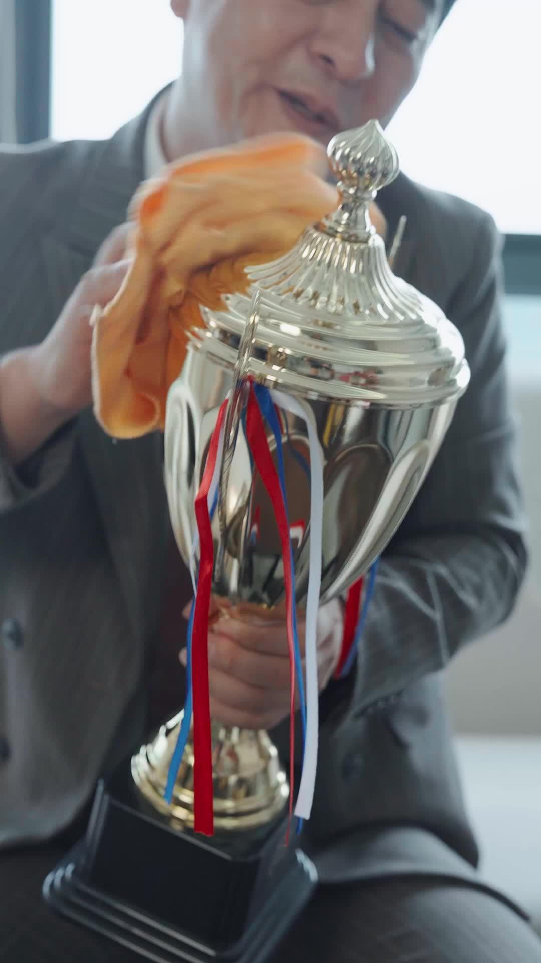 The opening shot is deceptively simple: a close-up of a silver trophy, its surface catching the daylight streaming through a large window. A hand—aged, steady, with veins tracing maps across the skin—gently strokes its rim with an orange microfiber cloth. The man holding it, Mr. Lin, is smiling, but it’s not the smile of triumph; it’s the smile of reverence, of someone communing with a sacred object. He brings the trophy closer, almost nuzzling it, his eyes closed for a beat, as if inhaling the scent of victory past. The ribbons—red, white, blue—flutter slightly, like flags in a breeze no one else feels. This isn’t mere cleaning; it’s a ritual, a daily affirmation of identity. In this quiet office, with its minimalist furniture and the distant green hills visible beyond the glass, the trophy is the only artifact of grandeur. Everything else—the tissue box, the potted plant, the leather-bound notebook—is functional, neutral. The trophy is the anomaly, the emotional core. And standing beside him, observing with quiet patience, is Xiao Mei. Her posture is impeccable: feet together, hands folded, shoulders relaxed. Yet her eyes tell a different story. They don’t reflect awe; they reflect assessment. She’s not admiring the trophy; she’s studying Mr. Lin’s relationship with it. When he finally sets it down on the coffee table, she doesn’t move, but her gaze lingers on the base, as if searching for an inscription, a date, a clue to why this object holds such power over him.