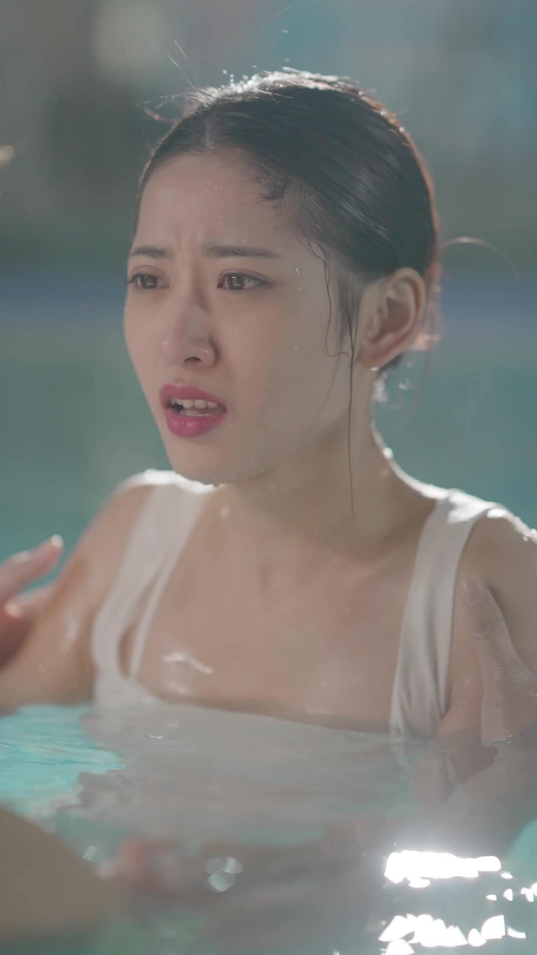 What follows is a masterclass in nonverbal storytelling. Li Zeyu places his hands gently on her upper arms—not restraining, not possessive, but anchoring. She flinches, then exhales, her shoulders softening as if surrendering to gravity—or to him. Their faces hover inches apart, breath mingling above the surface, while below, the water hides the tension in their fingers, the way her knuckles whiten where she grips his forearm. The lighting here is crucial: soft backlighting creates halos around their heads, turning them into figures from a dream—or a memory they’re trying to rewrite. When she finally speaks, her voice is barely audible over the gentle lap of water against tile, yet the words land like stones: ‘You knew… didn’t you?’ It’s not an accusation. It’s a plea for confirmation, for absolution. Li Zeyu doesn’t deny it. He simply nods, his eyes never leaving hers, and in that moment, the pool ceases to be a setting—it becomes a confessional.