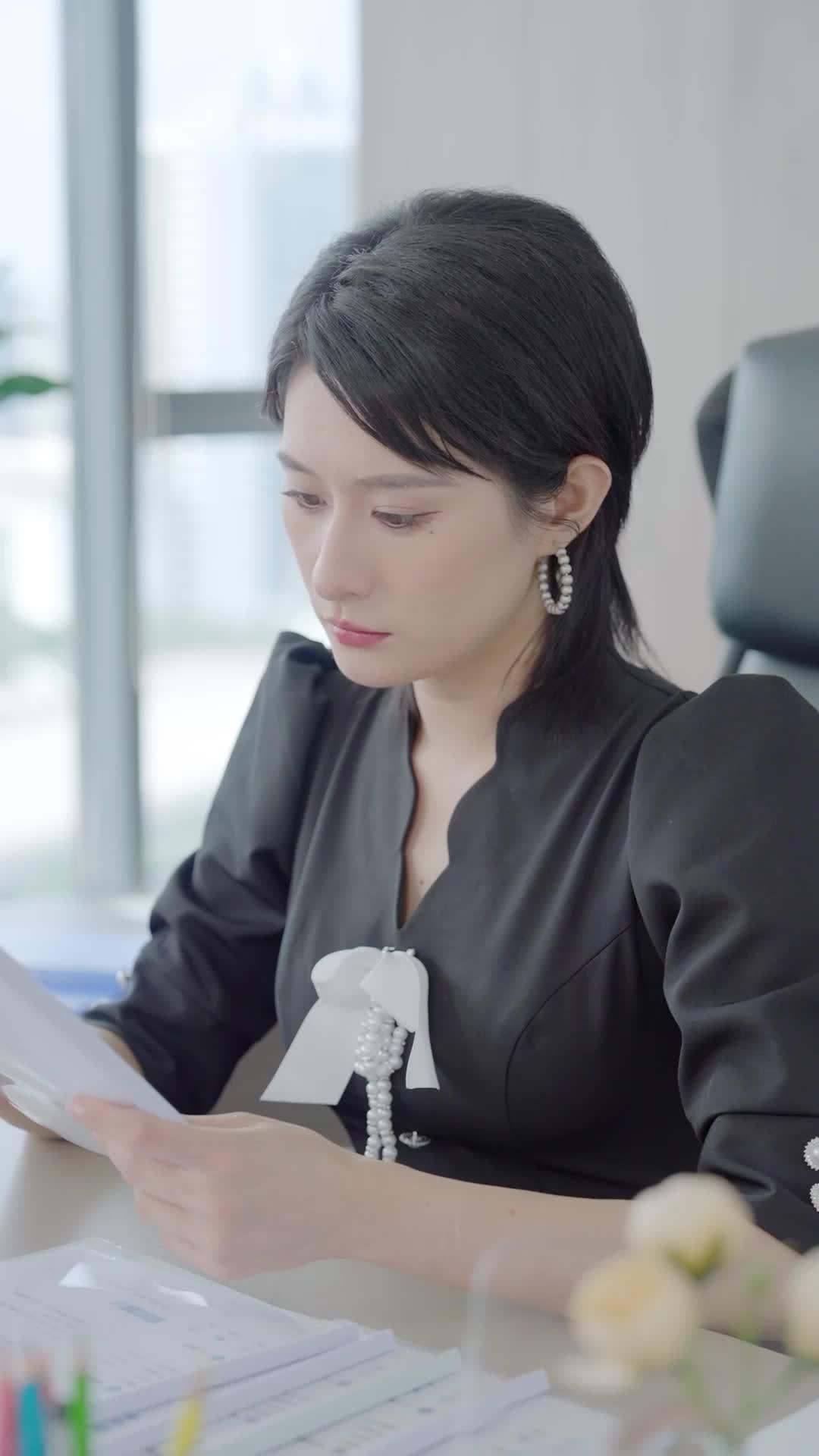 In a sleek, sun-drenched office where marble floors reflect ambition and potted greenery whispers corporate wellness, two women sit across a polished desk—Li Wei in black silk with a pearl-draped bow at her collar, and Chen Xiao in ivory chiffon, hands folded like a student awaiting judgment. This is not a routine HR session; it’s a psychological duel disguised as a job interview, and the quiet tension between them pulses like a live wire beneath the surface of polite decorum. Li Wei, seated behind the desk like a queen on her throne, flips through documents with deliberate slowness—each page turn a calculated pause, each glance upward a probe. Her earrings, large hoop pearls, catch the light like surveillance cameras, unblinking, assessing. Chen Xiao, meanwhile, maintains composure with practiced grace, but her fingers twitch near the pencil holder, her lips parting just enough to betray anticipation—or dread. The air hums with unsaid things: expectations, past failures, hidden resumes, and the fragile hope that this meeting might be the pivot point in her life.