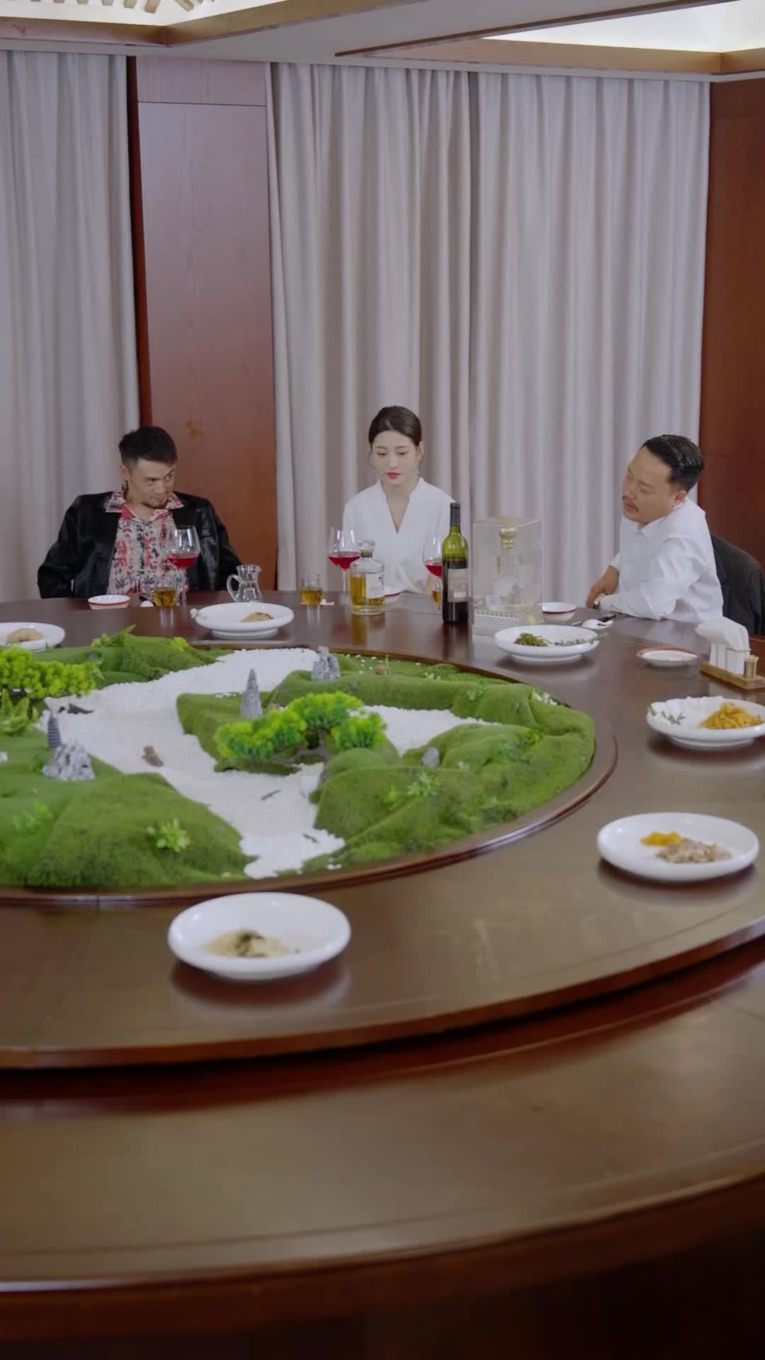 In the quiet opulence of a private dining room—wood-paneled walls, cream drapes drawn tight like curtains on a stage—the three characters of *Fortune from Misfortune* gather around a circular table that doubles as both banquet centerpiece and psychological arena. At its heart lies not food, but a miniature Zen garden: mossy hills, white gravel rivers, tiny stone pagodas, and bonsai shrubs arranged with obsessive precision. It’s a metaphor in motion—calm on the surface, turbulent beneath. And yet, this serene tableau is about to be shattered by the simplest of gestures: a toast.