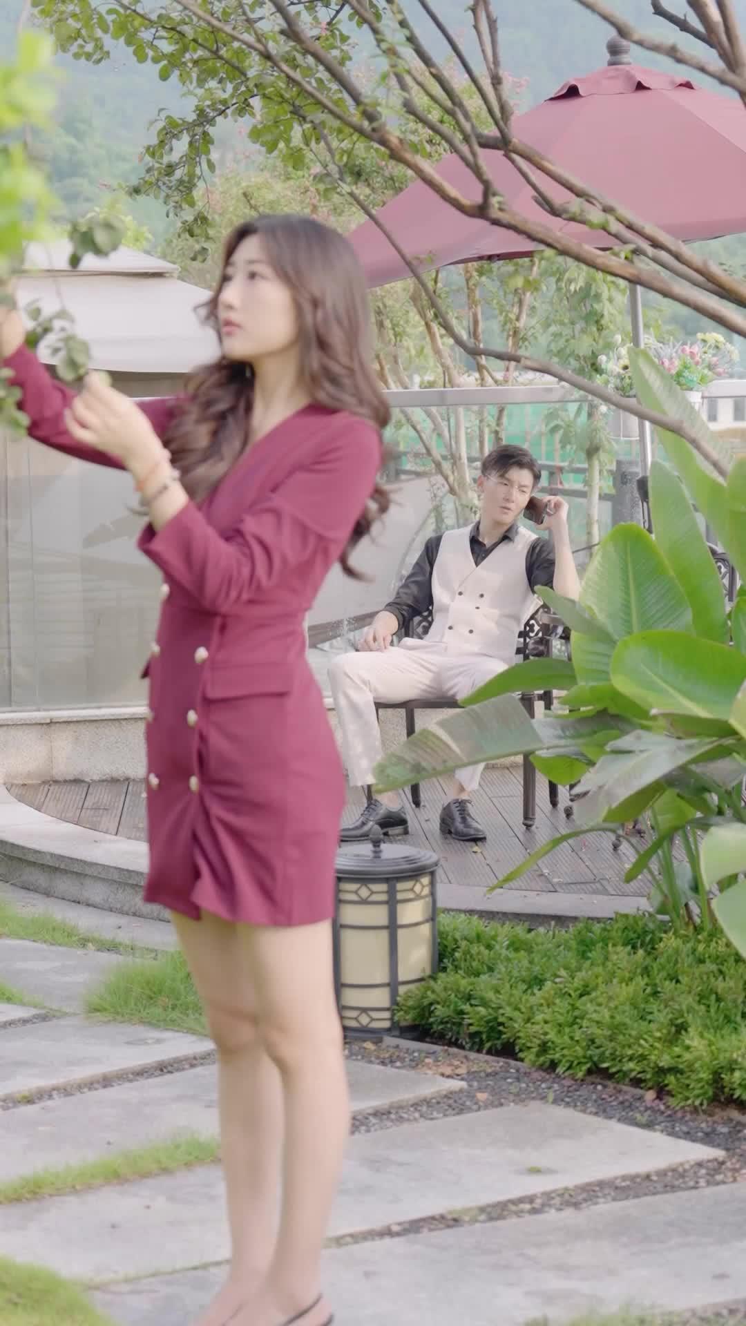 Let’s begin with Lin Xiao—the woman in the burgundy dress. She’s not just pruning roses; she’s performing a ritual. Her hands move with surgical precision, each cut measured, intentional. The camera loves her fingers: slender, adorned with a delicate gold bracelet, nails polished but not ostentatious. She’s not a gardener. She’s a strategist. And the rose bush? It’s not flora. It’s metaphor. Every leaf she removes is a lie she’s excising. Every thorn she avoids is a truth she’s refusing to confront. Behind her, Chen Wei sits like a statue—glasses reflecting the sky, posture relaxed, but his eyes never leave her. He doesn’t speak. He doesn’t gesture. He simply *observes*. And that’s the most terrifying thing of all: being watched without being seen. Chen Wei isn’t interested in the roses. He’s interested in the moment she slips. The moment her hand trembles. The moment the scissors slip.