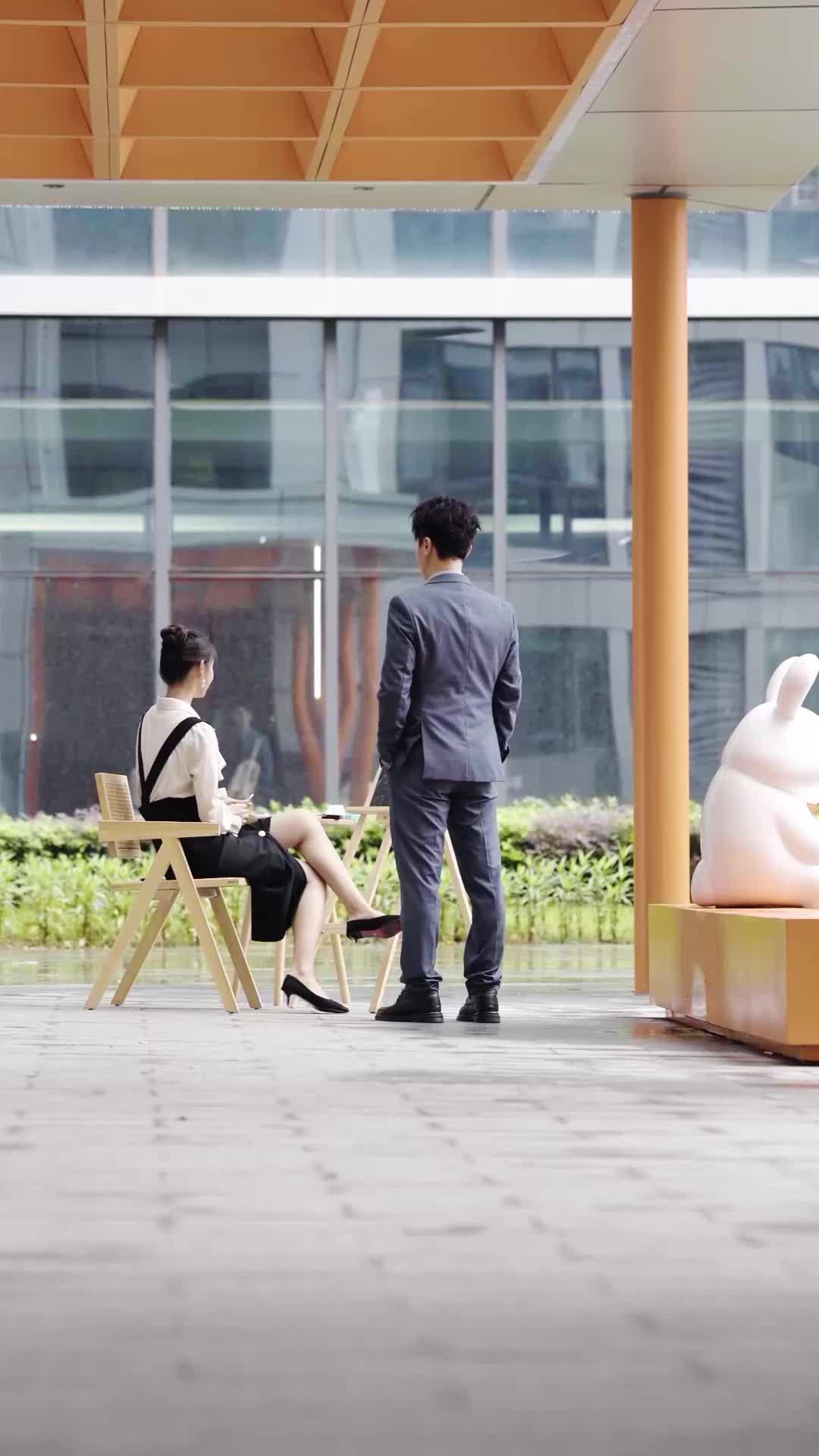 In the sleek, sun-dappled courtyard of a modern urban plaza—where glass towers reflect the sky like mirrors and a giant pastel rabbit sculpture sits silently like a silent witness—the tension between Lin Xiao and Chen Wei unfolds not with shouting or grand gestures, but with the quiet weight of an envelope. From Bro to Bride, this scene is less about dialogue and more about micro-expressions, posture shifts, and the unbearable suspense of what’s written on that thin brown paper. Lin Xiao, dressed in a cream ruffled blouse layered under a black suspender skirt adorned with gold buttons, exudes controlled elegance—her hair pinned in a neat chignon, pearls resting delicately at her collar, earrings catching light like tiny stars. She sits first, legs crossed, heels planted firmly on the tiled floor, as if anchoring herself against the storm she knows is coming. Chen Wei stands opposite, hands buried in his pockets, wearing a tailored charcoal three-piece suit that speaks of corporate discipline and emotional restraint. His stance is rigid, yet his eyes betray something softer—hesitation, perhaps regret, or even longing. When Lin Xiao rises, the camera lingers on the way her fingers tremble just slightly before clasping together in front of her waist. That small detail tells us everything: she’s rehearsed this moment. She’s waited for it. And now, she’s delivering it.