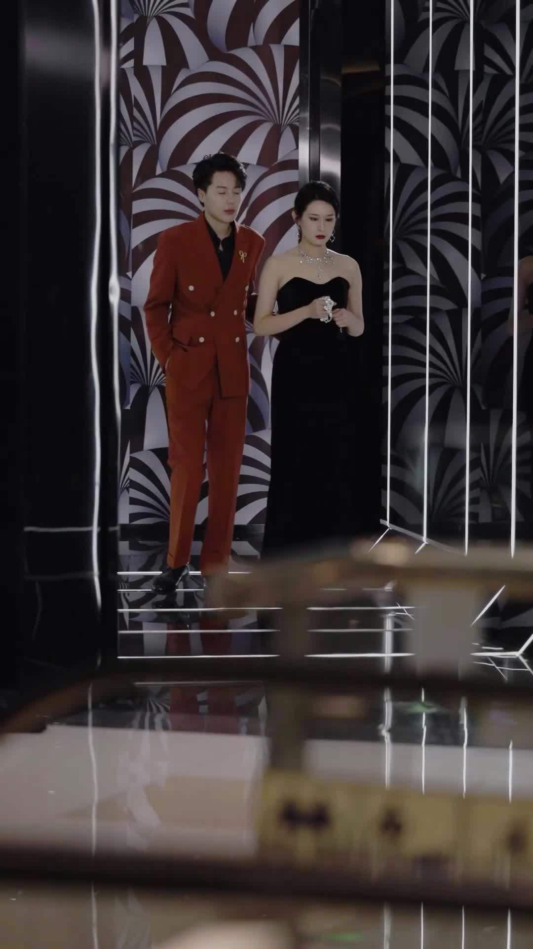 Let’s talk about the kind of cinematic tension that doesn’t need explosions or car chases—just a rust-colored double-breasted suit, a black velvet gown dripping with diamonds, and two people who clearly know each other far too well. In the opening sequence of *From Bro to Bride*, we’re dropped into what looks like a gala entrance—or maybe a trapdoor disguised as one. The backdrop is hypnotic: swirling black-and-white spirals, vertical LED strips casting sharp lines across the floor like prison bars made of light. It’s not just décor; it’s psychological architecture. And standing in its center are Li Zeyu and Shen Yanyan—two figures whose body language screams ‘we were once inseparable, now we’re barely tolerating the same air.’