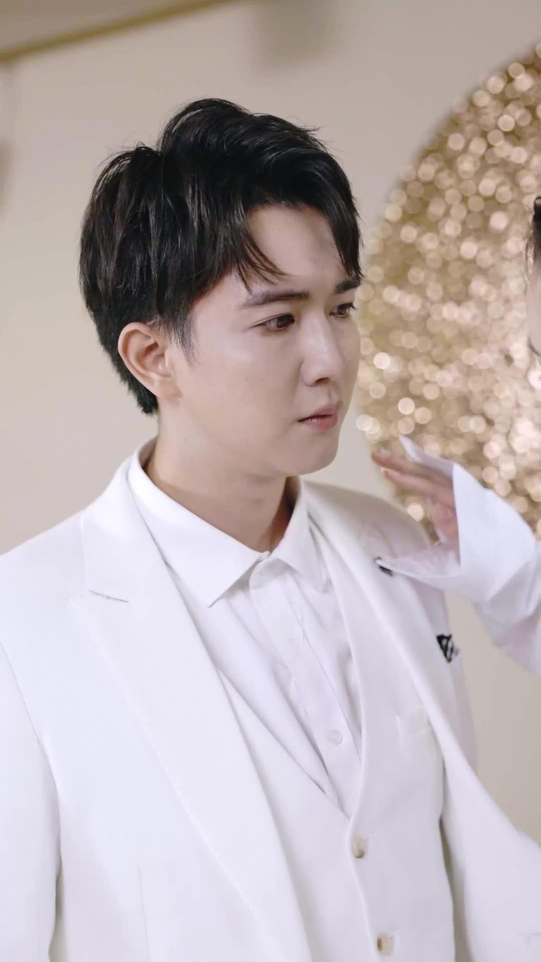 Let’s talk about the quiet chaos of a white suit in a room that smells like expensive linen and unresolved tension. In *From Bro to Bride*, the opening sequence isn’t just aesthetic—it’s psychological warfare dressed in three-piece tailoring. Lin Zeyu, impeccably groomed in ivory wool with a crown pin and monogrammed pocket square, doesn’t walk into the scene—he *settles* into it, like a man who’s rehearsed his composure but not his reactions. His posture is rigid, his hands folded like he’s waiting for a verdict, not a conversation. Beside him, Xiao Ran—long hair parted just off-center, wearing an oversized white shirt that slips slightly off one shoulder—doesn’t sit so much as *hover*, her knees drawn inward, fingers interlaced like she’s holding herself together. The camera lingers on their proximity: less than twelve inches apart, yet emotionally light-years away.