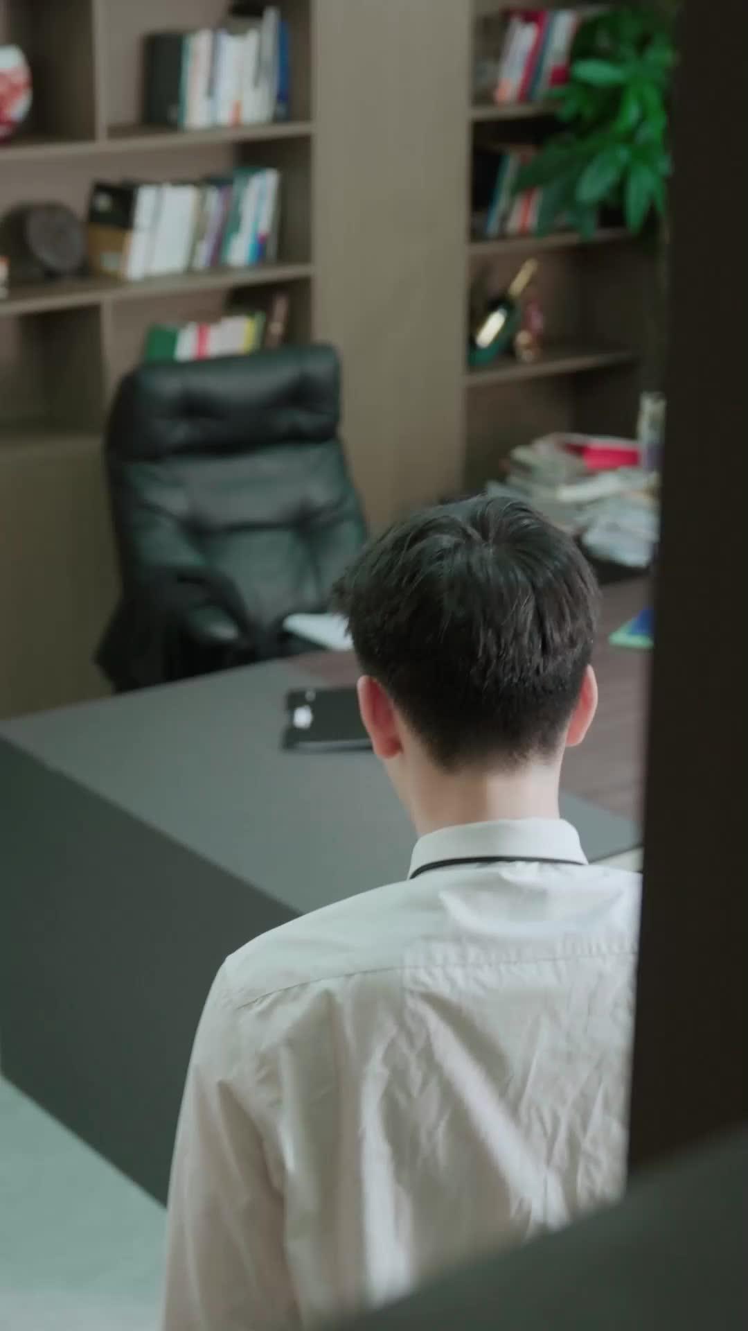 Later, when Lin Jian sinks into the black leather chair—his own chair, now usurped by circumstance—the shift is seismic. He’s no longer the accuser. He’s the accused. His hands, once dominant on the desk, now twist together in his lap, knuckles white. Chen Yu stands over him, not towering, but *present*, like a shadow that refuses to recede. The blue folder is still there, but now it’s resting on the desk between them, open just enough to reveal a single photograph tucked inside. We don’t see the image, but Lin Jian does—and his breath hitches. That’s the genius of *From Deceit to Devotion*: it understands that truth isn’t revealed in monologues. It’s revealed in the split-second hesitation before a man reaches for his phone, in the way Chen Yu’s thumb brushes the edge of the photo like he’s tracing a wound. The scene ends not with resolution, but with suspension—a held breath, a frozen frame, the kind of moment that lingers long after the screen fades. And somewhere, in the background, that green plant sways ever so slightly, as if even it knows the world just tilted off its axis. *From Deceit to Devotion* isn’t about who’s lying. It’s about who’s willing to believe the lie—and why.