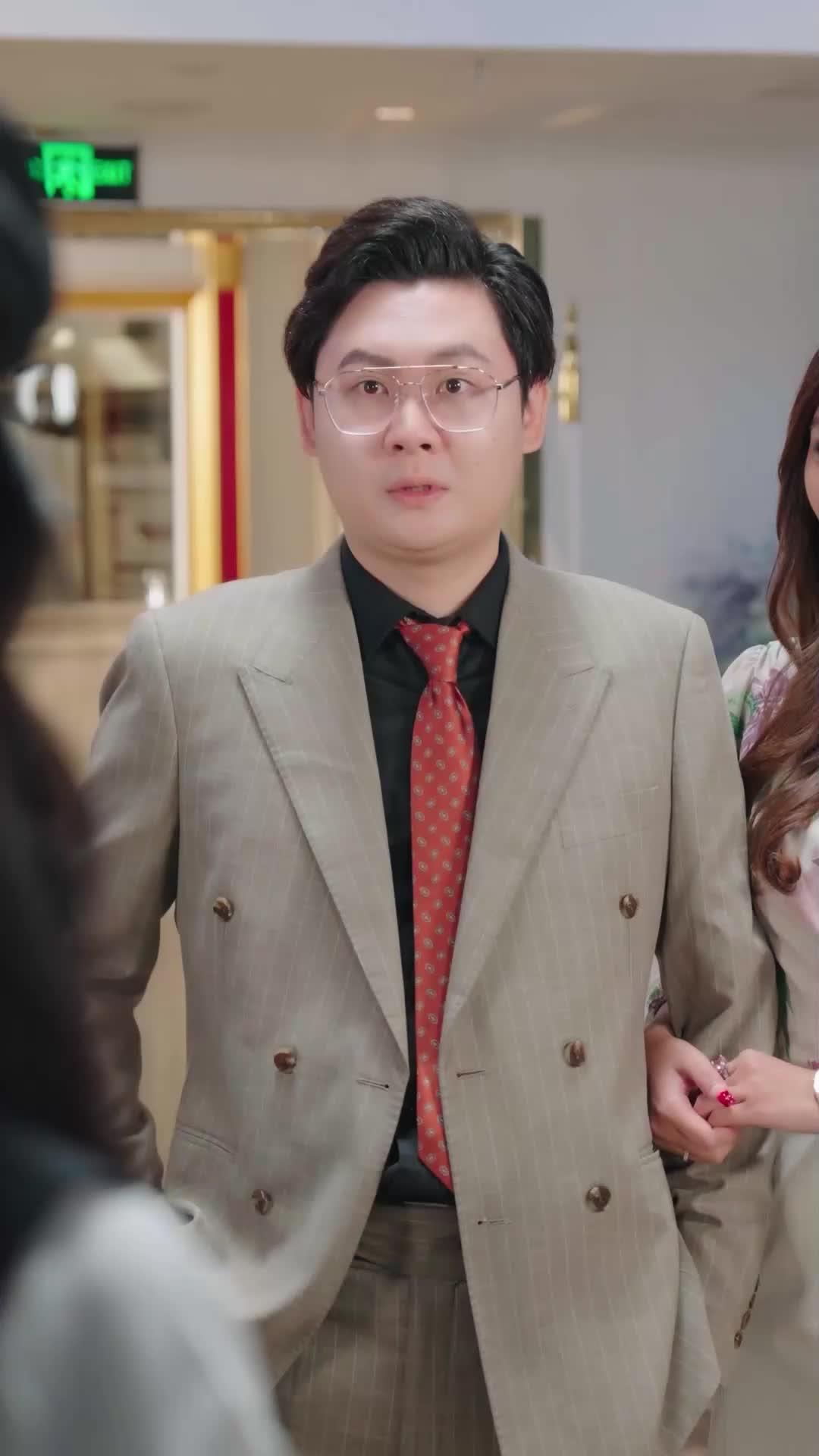 In the opulent marble corridor of what appears to be a high-end event venue—perhaps a gala, a press launch, or even a staged corporate summit—the air hums with tension disguised as civility. The polished floor reflects not just the glittering chandeliers above but also the fractured expressions of those caught in the crossfire of performance and truth. At the center of this tableau stands Li Wei, impeccably dressed in a double-breasted beige pinstripe suit, his red patterned tie a bold declaration against the black shirt beneath—a man who seems to have rehearsed every gesture, every blink, yet whose composure begins to unravel like thread pulled from a frayed seam. Beside him, Chen Xiaoyu clings—not physically, but emotionally—with her fingers laced through his forearm, her floral silk dress whispering elegance while her pearl necklace glints like a silent plea for stability. Her smile is wide, practiced, almost too bright; it flickers when she glances toward the woman in black: Lin Mo.