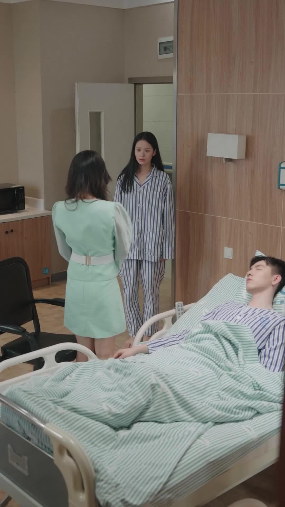 The hospital room—sterile, softly lit, with wood-paneled walls that whisper of quiet authority—becomes a stage where emotional truths are neither spoken nor denied, but *felt*. In this tightly framed sequence from the short drama *From Deceit to Devotion*, every gesture, every glance, and every hesitation speaks louder than dialogue ever could. What begins as a seemingly routine visit quickly unravels into a psychological ballet of guilt, longing, and unspoken reckoning. At the center stands Lin Xiao, dressed in a mint-green ensemble that feels deliberately curated—its pearl buttons and sheer sleeves suggest elegance, but the white ribbon tied at her waist reads like a plea for innocence. Her posture is poised, yet her fingers twist subtly at her waistband, betraying nerves she refuses to name. She enters not as a visitor, but as a claimant—someone who believes she still holds rights to the space, to the man lying half-asleep in the bed, draped in matching striped linens. That man, Chen Wei, remains motionless, eyes closed, breathing steady—but his presence looms large even in repose. His stillness isn’t peace; it’s suspension. And it’s into this suspended moment that Lin Xiao steps, smiling faintly, as if rehearsing a role she’s played before.