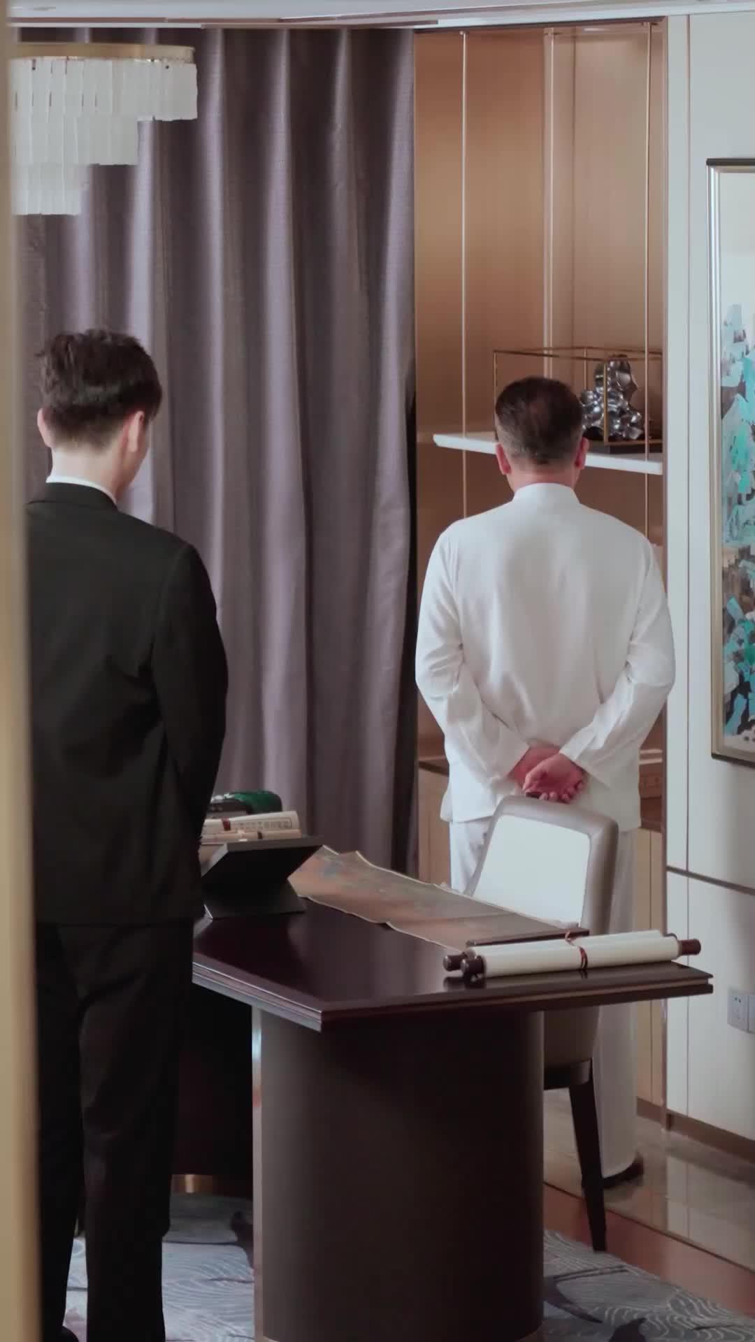 The genius of *From Deceit to Devotion* lies not in what is said, but in what is withheld—and how the body betrays the mind when words fail. Consider the first ten seconds: two men, one in black, one in white, standing across a desk like opposing generals on a chessboard. Lin Wei, immaculate in his bespoke suit, wears his anxiety like a second skin—his fingers interlaced too tightly, his watch catching the light like a beacon of nervous energy. Elder Chen, meanwhile, stands with hands behind his back, posture erect, exuding the calm of a man who has already won the war before the first bullet is fired. The camera lingers on his face—not in close-up, but in medium shot, allowing us to see the subtle tremor in his lower lip when he speaks, the way his eyebrows lift just enough to suggest amusement, not approval. He doesn’t need to raise his voice. His presence alone is indictment enough.