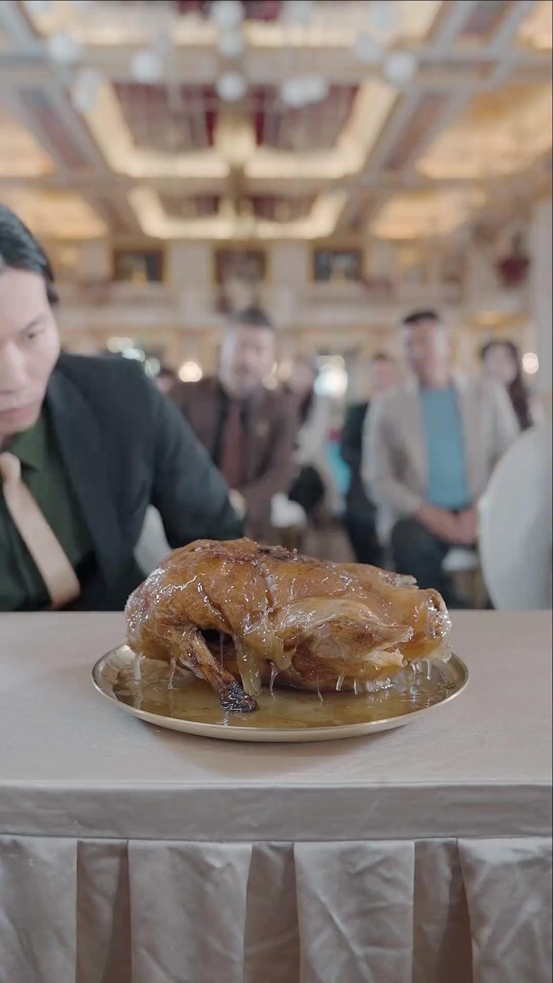 The opening shot lingers on a glistening roasted duck—crispy, amber-hued, dripping with syrupy glaze—resting like a sacred relic on a gold-rimmed platter. It’s not just food; it’s a statement. In the background, blurred but unmistakable, sits Zhang Shiwei—his expression unreadable, lips pursed, eyes narrowed as if he’s already dissecting the dish before tasting it. The setting is opulent: chandeliers hang like frozen constellations, white tablecloths ripple under soft light, and the audience—dressed in tailored suits and silk blouses—leans forward in unison, breath held. This isn’t a dinner. It’s a trial. And the duck? The first witness.