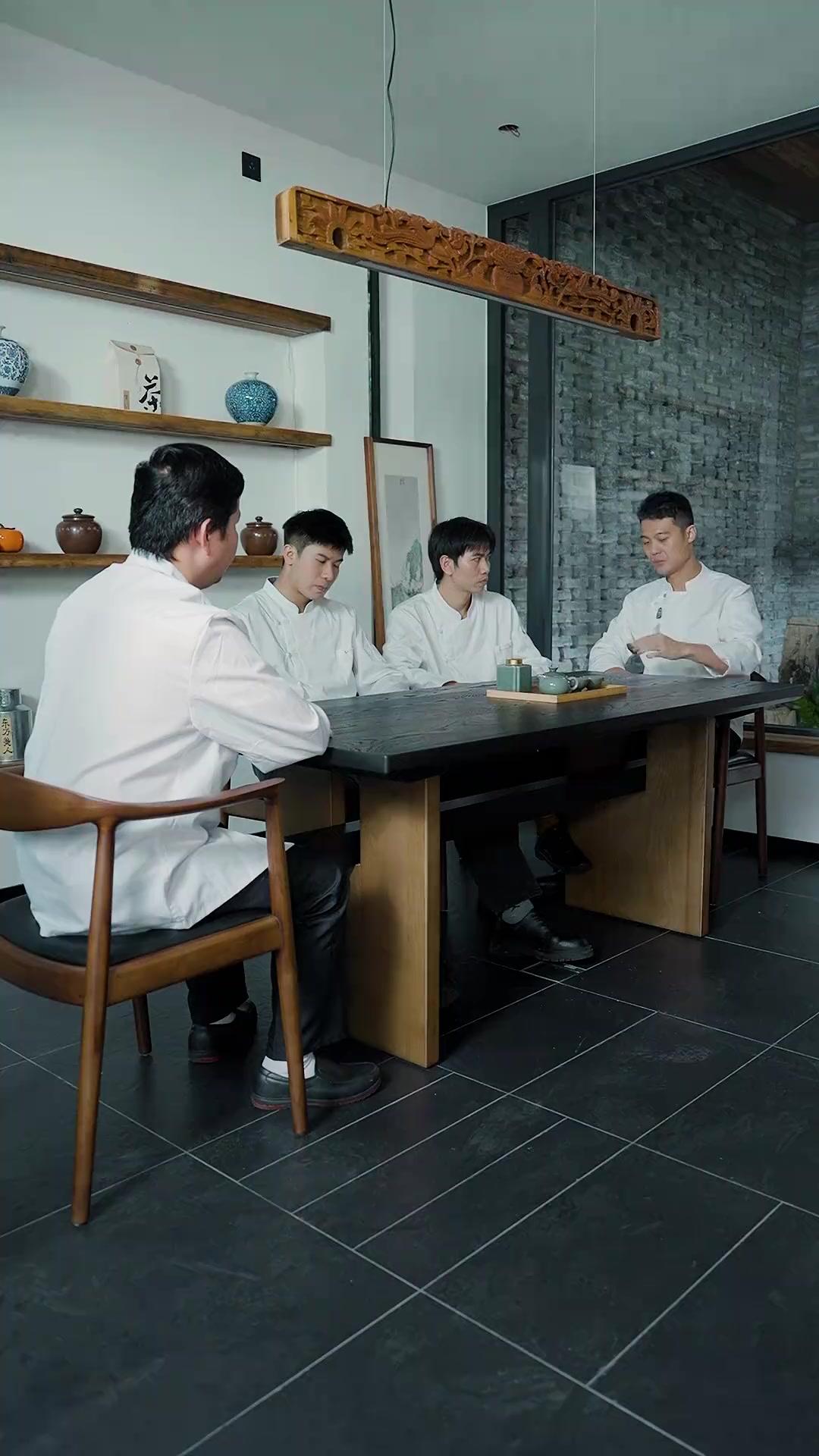 There’s a moment—barely two seconds long—in the latest arc of God of the Kitchen where Chen Jie lifts his teacup, pauses mid-sip, and his eyes flick upward, just enough to catch Lin Wei’s gaze across the table. That micro-second contains more narrative gravity than most full episodes of other series. It’s not the tea that matters. It’s what the tea represents: ritual, submission, challenge, memory. Four men, four chefs, one table, and a thousand unspoken histories swirling in the steam rising from their cups. The room is stark, elegant, almost monastic—black tiles underfoot, natural light filtering through frosted glass, shelves holding ceramic vessels like sacred relics. Yet within this tranquility, a psychological earthquake is unfolding. Lin Wei, the patriarchal figure whose very stillness radiates control, sits with his hands flat on the table, fingers aligned like chopsticks laid out for service. He doesn’t fidget. He doesn’t glance away. He waits. And in that waiting, he exerts dominance. Chen Jie, by contrast, is all contained motion: a slight tilt of the wrist as he sets down the cup, a breath held too long before speaking, the way his left thumb brushes the embroidered wave on his chest—subtle, but unmistakable. That embroidery isn’t decoration. It’s a declaration. ‘Yun Feng’—Cloud Peak—refers to the legendary mountain where the oldest culinary texts were said to be inscribed. To wear it is to claim lineage. To question it is to risk exile.