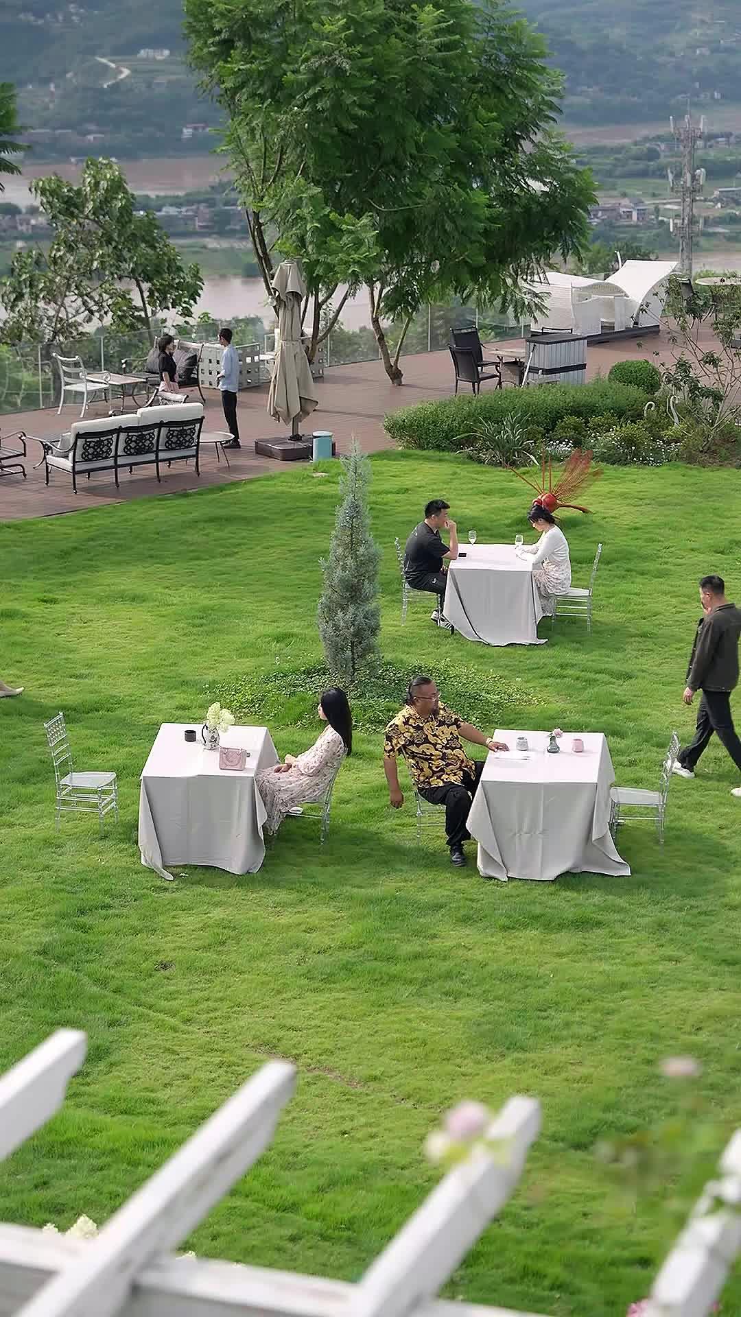 There’s something deeply unsettling about a perfectly manicured lawn when it becomes the stage for emotional detonation. In *Gone Ex and New Crush*, the opening shot isn’t just scenic—it’s strategic. A wide-angle view of a hillside garden, tables draped in ivory linen, guests seated like chess pieces on a green board—this isn’t a picnic. It’s a setup. And the camera knows it. Every rustle of the feather-print dress worn by Lin Xiao, every flick of Chen Hai’s phone screen as he walks in late, every sip taken by the man in the dragon-patterned shirt (Mr. Zhao, we’ll call him)—all are calibrated gestures in a performance that’s already begun before the first word is spoken.