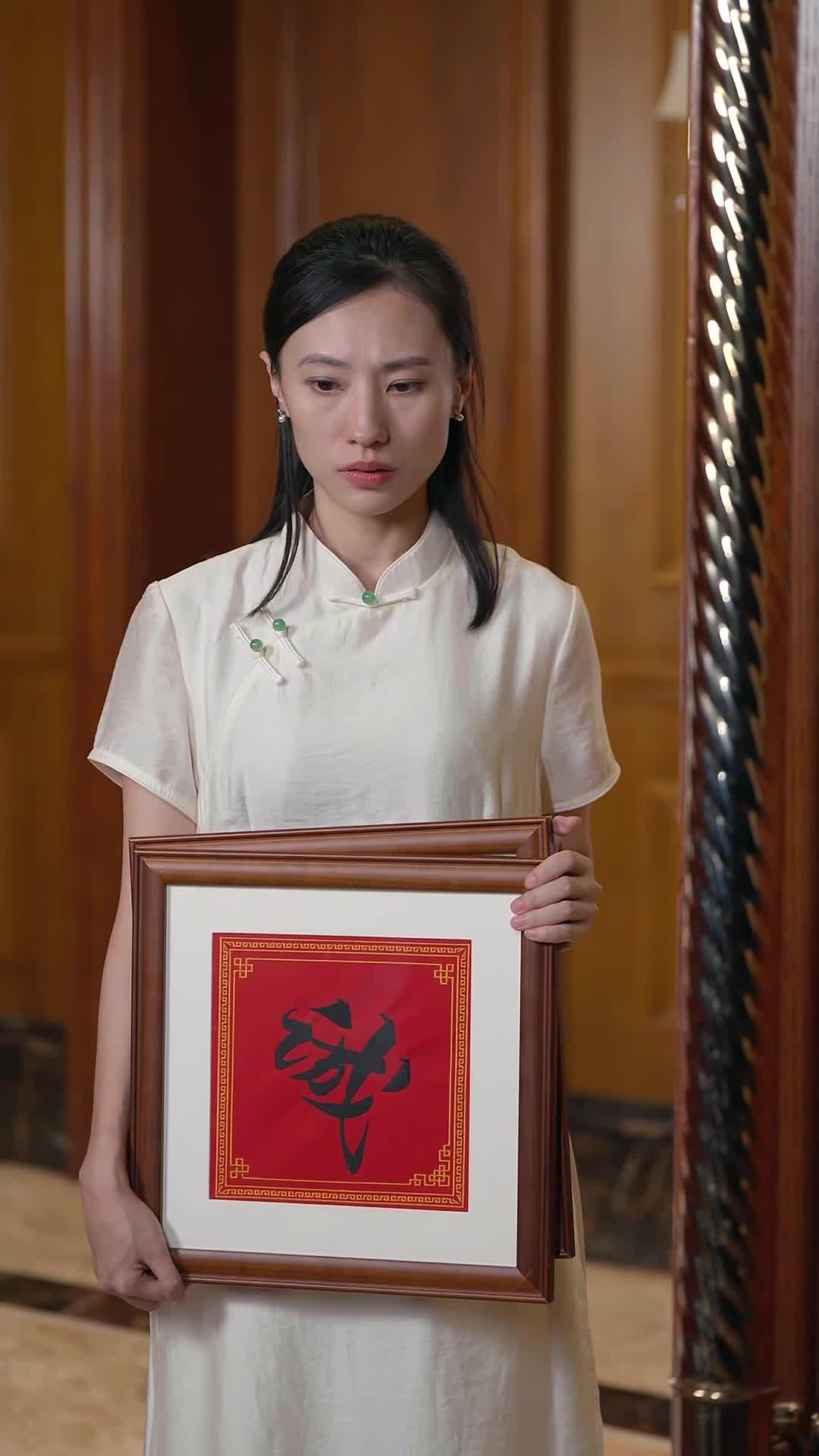 Let’s talk about the most unsettling object in the entire sequence: not the cane, not the chandelier, not even the cold stare of Zhao Wei—but a square of red silk, bordered in gold thread, mounted behind glass in a simple walnut frame. In *Gone Ex and New Crush*, that frame isn’t decoration. It’s a landmine. And the woman who carries it—Ling, with her ivory qipao and green jade toggles—doesn’t walk into the room. She *enters* it like a priestess bringing relics to a sacrificial altar. Her steps are measured, her breath shallow, her knuckles white where they grip the frame’s edge. She doesn’t look at the men. She looks *through* them, as if already seeing the aftermath. That’s the genius of the scene: the threat isn’t verbal. It’s visual. It’s cultural. It’s encoded. The character ‘诚’—sincerity—is written in bold, fluid strokes, the ink bleeding slightly at the edges, as if applied in haste or under duress. Was it painted yesterday? Last year? During a moment of drunken confession? The show leaves it ambiguous, and that ambiguity is the point. In a world where loyalty is transactional and truth is negotiable, sincerity becomes the rarest, most dangerous commodity. And Ling isn’t offering it. She’s accusing someone of having lost it.
