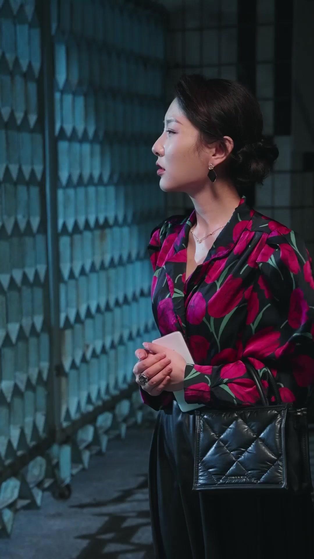 In the dim, blue-tinged alley behind a rusted metal gate—its diamond-patterned bars casting sharp shadows like prison bars—the first act of *Goodbye, Brother's Keeper* unfolds with chilling precision. A woman stands poised, her posture elegant but tense, clutching a pale smartphone like a talisman. Her floral blouse—bold magenta tulips against black silk—contrasts violently with the decay around her: peeling tiles, damp concrete, the faint smell of mildew clinging to the air. She is not just waiting; she is *assessing*. Every micro-expression flickers across her face—curiosity, impatience, then a subtle tightening around the eyes—as if she’s rehearsing lines in her head before the real performance begins. This is not a chance encounter. It’s a staged intervention.