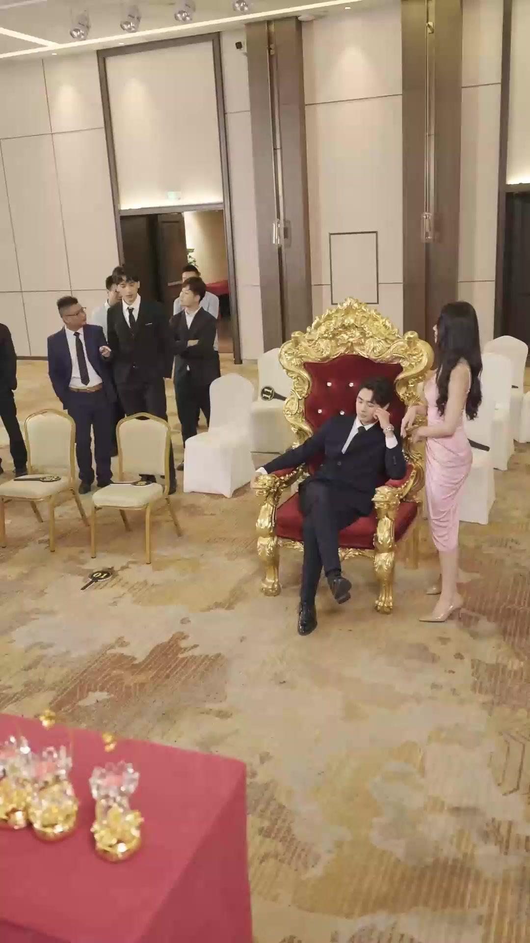 In the opulent ballroom of what appears to be a high-stakes corporate gala—or perhaps a clandestine power summit—every gesture, every glance, carries the weight of unspoken alliances and buried tensions. At the center of it all sits Lin Zeyu, draped in a navy pinstripe double-breasted suit that whispers authority without shouting it. His posture is relaxed, almost languid, one elbow resting on the arm of an ornate golden throne carved with coiling dragons—a throne not meant for ceremony alone, but for judgment. Beside him stands Xiao Man, her pink satin dress clinging like liquid silk, her hands clasped low, fingers interlaced with practiced restraint. She does not speak much, yet her eyes track every shift in the room like a hawk circling prey. This is not a social gathering; this is a stage where roles are assigned, not chosen.